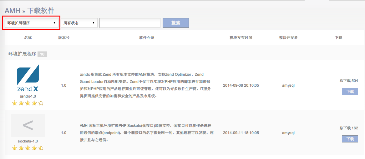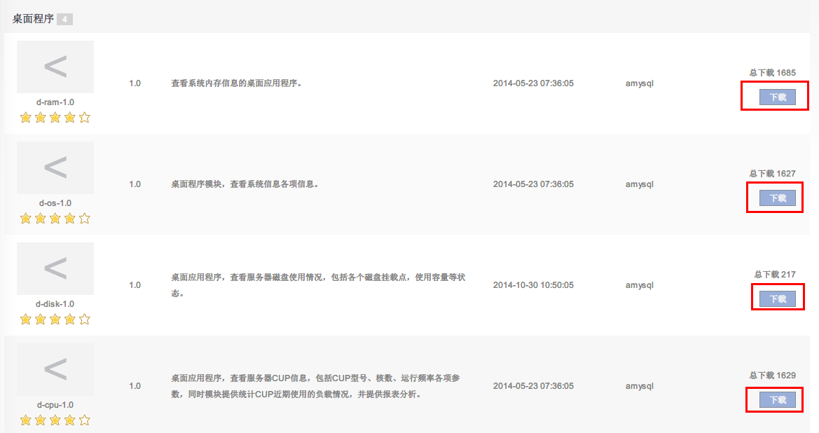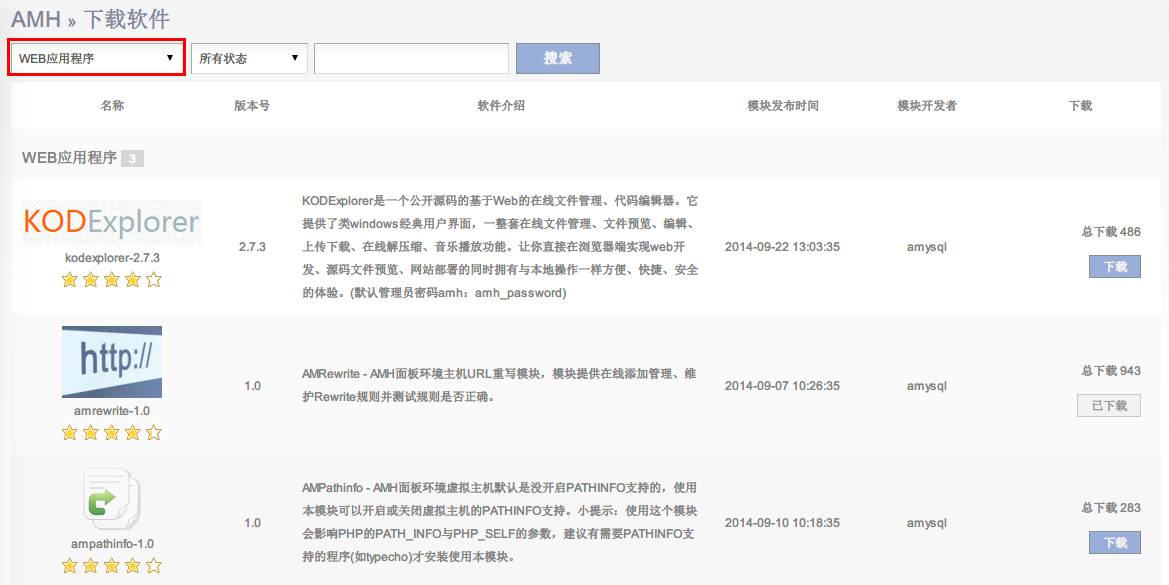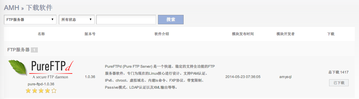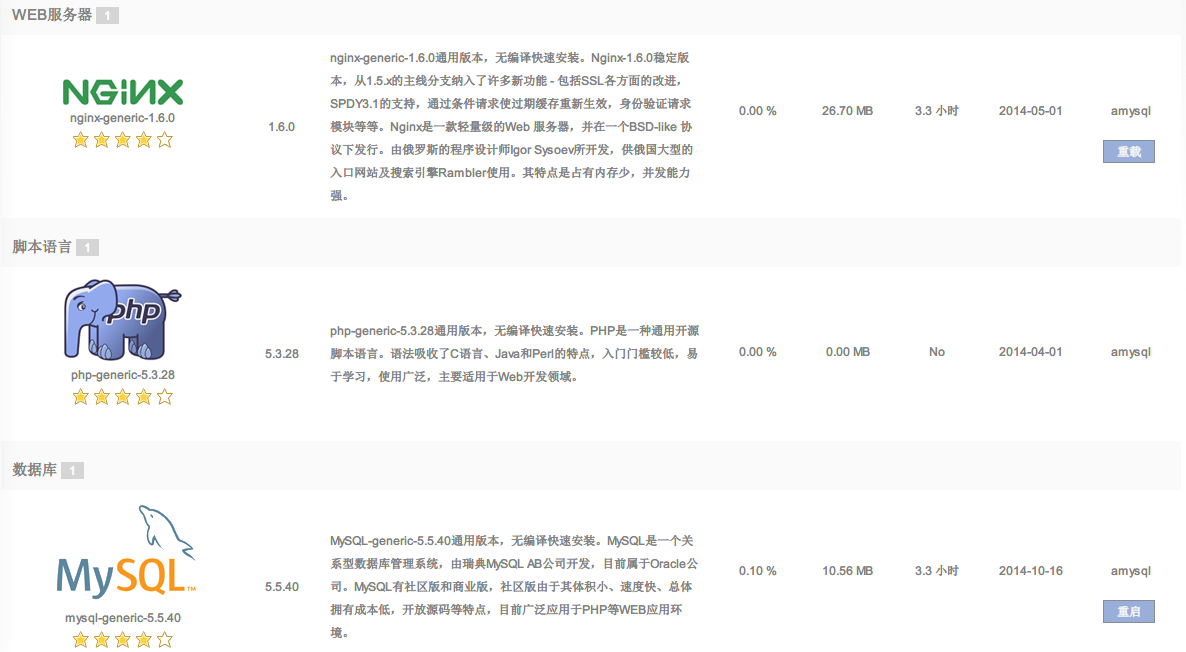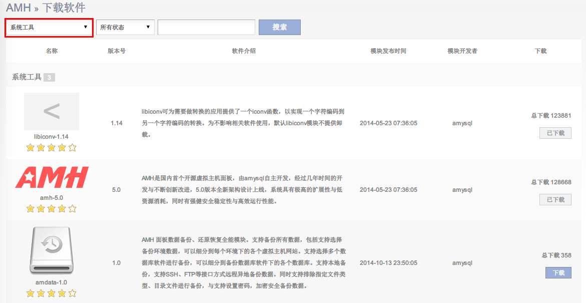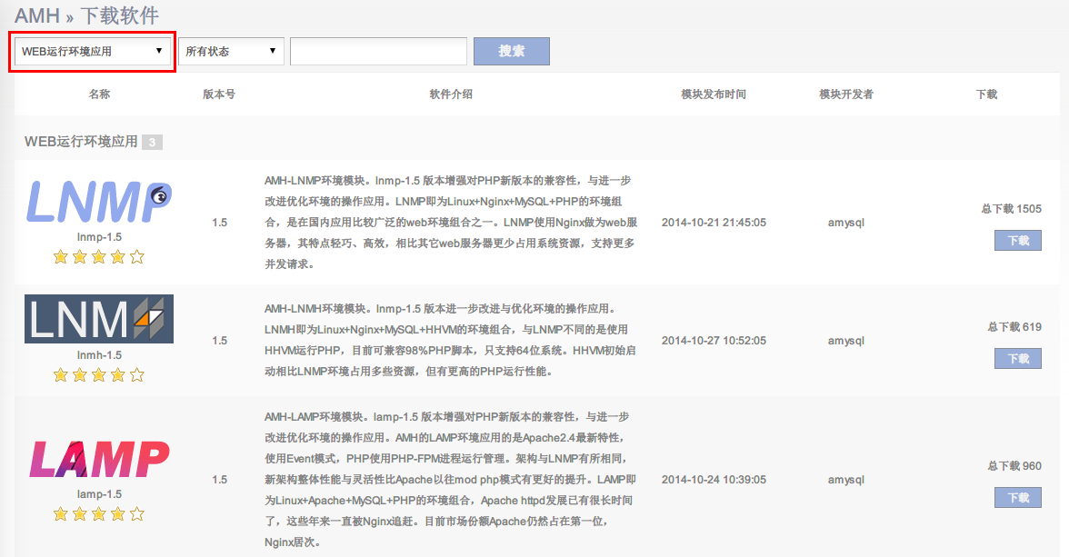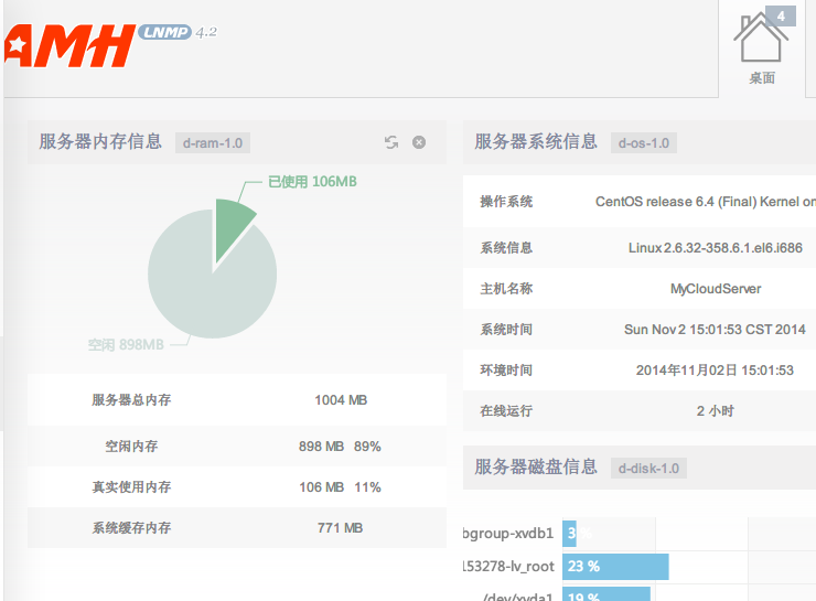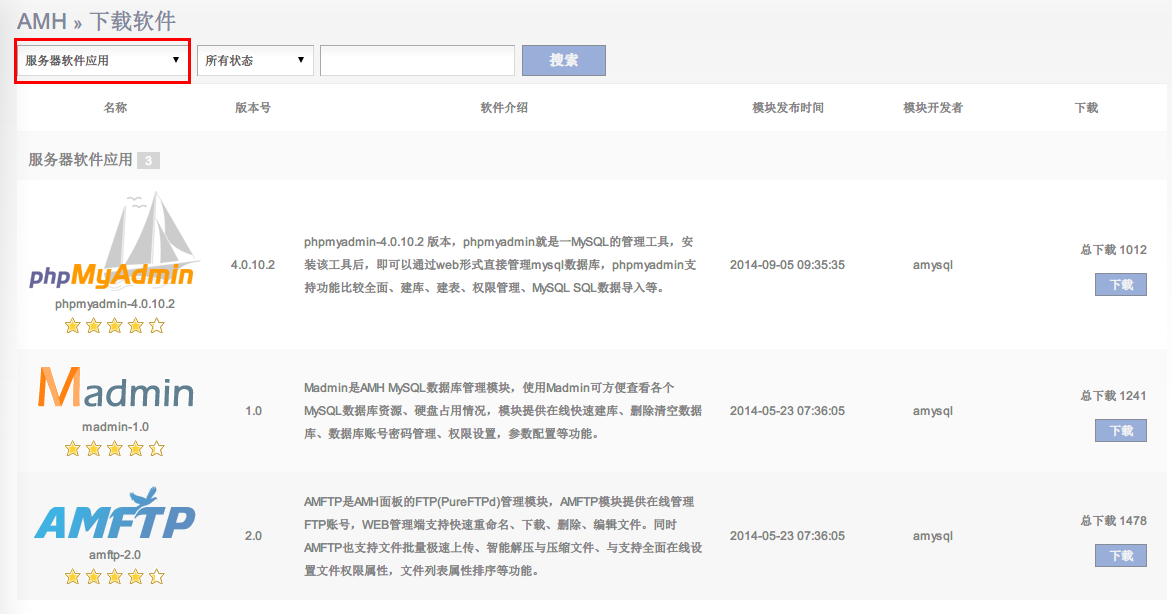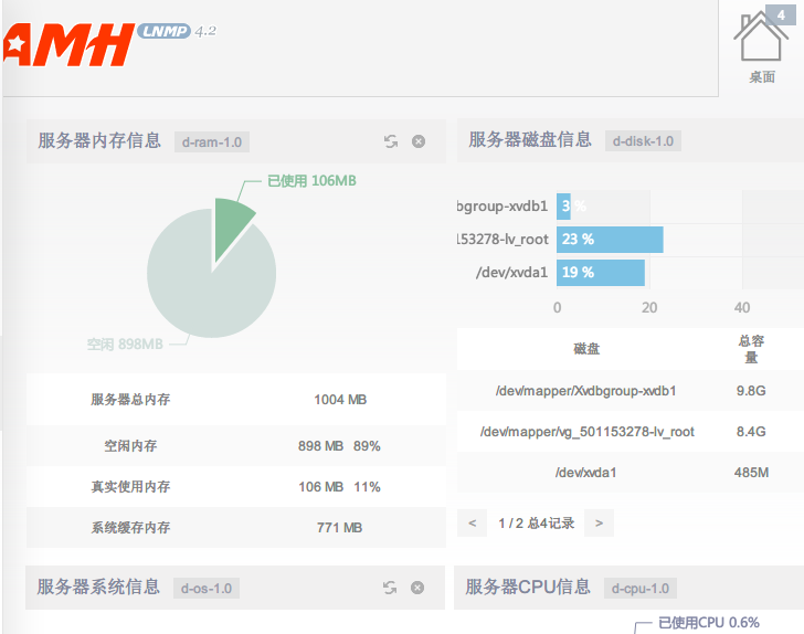 引用: 写在前面: 作为一个VPS新手,开这个帖子旨在帮助同为新手的朋友们如何基础使用AMH5.0面板进行建站。 由于本人也是个新手,所以除面板安装过程外,其余均在AMH5.0面板WEB端截图介绍。 帖子中如果有常识性错误,还请各位大牛不吝赐教。 希望在完成这个系列之后,自己和同为新手的朋友们都能得到一些提高。 支持 对了,不喜勿喷,谢谢合作。 -- 另外,由于标题不能写太长,所以我估计我以后发的这个系列的帖子都将会是一样的标题, 在每个帖子内,我都会有一个目录,供大家找到自己想要的那一部分介绍。 目录: 系列一:如何安装AMH5.0面板(直达) 系列二:AMH5.0面板基础模块(软件)的安装和选择(本帖) 系列三:几个基础模块(软件)的使用方法(直达) 系列四:如何建立WEB运行环境和虚拟主机(直达) 系列五:综合使用AMH5.0多个模块(软件)建立一个Discuz! 网站(直达) 【菜鸟互助】【图文介绍如何安装使用AMH5.0并建立网站】 【系列二】【AMH5.0面板基础模块的安装和选择】 这节开始,各位菜鸟需要先了解一下这些模块(软件)到底是什么东西, 如果有人使用过AMH4.2版本的话,会知道那个版本的时候很多功能都是集成在面板中的, 但是随着5.0版本的升级,AMH面板中不再集成绝大多数的模块,而需要大家自己手动下载安装, 这就造成了很多人包括我在内的,刚开始使用的时候的茫然, 大家可以将模块理解为一些组件,在AMH5.0的基础上,只有将一些组件安装上之后才可以使用某些功能。 就好比你必须在电脑上安装QQ才能用QQ跟人聊天一样。 你必须在AMH5.0面板上安装诸如phpMyadmin之后才能使用这个工具来管理MySQL数据库。 而且AMH5.0面板中又将各种模块分类为【桌面软件】【服务器软件】【环境软件】和【应用软件】 接下来,我们一一介绍~ 一、AMH5.0桌面软件 起初刚开始使用的时候,我也认为这是PC端的桌面软件 但实际上,AMH5.0之后,默认面板的首页叫做【桌面】 在这里安装的应用就叫做【桌面软件】 ![]() 第一次进入桌面的时候,这里是空白的,有一个【桌面程序下载】的按钮 ![]() 单击后进入上图示的下载界面,根据自己的需要点击下载 ![]() ![]() 下载成功后,再次进入桌面,即可看到一堆凌乱的模块, 实际上,这些模块是可以直接用鼠标拖动摆放的,强迫症表示必须摆放整齐! ![]() 整齐之后的样子…… 桌面软件其实就只有这四个,基本涵盖了所有服务器信息的数据。 都展示在这里。 【由于缓存原因,上图中的AMH LOGO 版本号是 4.2,下文将重新截图,这几张图就不改了……】 二、AMH5.0服务器软件 服务器软件,顾名思义就是你这台服务器想要运行网站或其他程序时需要安装的软件 ![]() 如上图示,又分类为:【DNS服务器】【WEB服务器】【脚本语言】【数据库】【FTP服务器】【邮件服务器】和【V_PN服务器】 而AMH5.0面板在安装的时候,是默认集成如下图示的几个服务器软件的: ![]() 这三个大家应该不陌生,加上服务器系统Linux,就是所谓的LNMP了~ 但是在AMH5.0面板中,如果想要使用LNMP环境进行虚拟机建立,那么现在已有的软件还远不够。 这三个已经安装的软件应该是给AMH本身提供服务用的。 现在我们进入【下载软件】选项卡 这里必须吐槽一下,由于前面几个选项卡命名都是【XX软件】,【XX】是【软件类型】。 而【下载软件】的【下载】却是一个【动词】,建议官方将这里改为【软件下载】,免得引发歧义。 ![]() 如上图示,在分类中也一样是有各种各样的分类,选择一个分类后,点击右侧的搜索,可查看这个分类下的所有软件。 由于【DNS服务器】一般用不到,【WEB服务器】【脚本语言】和【数据库】软件已经默认集成。 所以这里选择【FTP软件】分类,如下图示,有一个PureFTPd的软件可以下载 ![]() 点击下载,并转回到【服务器软件】选项卡后,可以在最下面找到一个新的【FTP服务器】的分类 如下图示,在最右侧可以启动或卸载(我已经安装了,否则默认这里是安装和删除) ![]() 由于【V_PN服务器】【邮件服务器】都只有一个软件可以下载并且也不是必备组件,这里也略过。 三、AMH5.0环境软件 转到环境软件选项卡,大家会发现这里空空如也, ![]() 点击分类,如上图示可以看到被分成了【WEB运行环境应用】和【服务器软件应用】两类 现在,再次转到【下载软件】选项卡,选择【WEB运行环境应用】分类并搜索, ![]() 如上图示,【WEB运行环境应用】总共有三款 其中,LNMP就是Linux+Nginx+MySQL+PHP LAMP就是Linux+Apache+MySQL+PHP LNMH则是Linux+Nginx+MySQL+HHVM 大家根据自己的实际需要进行选择即可,个人比较推荐使用LNMP 这里大家可能会有些以为,为什么明明已经安装了Nginx、MySQL和PHP,还需要单独安装这个LNMP软件呢? 这里,大家可以理解为,LNMP这个【WEB运行环境应用】是对上述三个【WEB服务器】【脚本语言】【数据库】软件起到整合管理作用。 并且必须安装后才可以建立虚拟机,从而建立网站。 接下来,我们选择【服务器软件应用】分类并搜索, ![]() 可以看到以后如上图所示的三个软件可以安装。 分别是,phpMyAdmin、Madmin和AMFTP, 简单介绍一下:phpMyAdmin、Madmin都是数据库管理软件, 后者就是AMH4.2版本中集成的那个模块,而前者则是大名鼎鼎的数据库管理软件。 两个都推荐安装,新手使用后者快速建立数据库和数据库用户,老鸟可以使用前者进行MySQL的高级操作。 而AMFTP则是前文中【PureFTPd】的管理软件,通过这个软件可以在AMH5.0面板