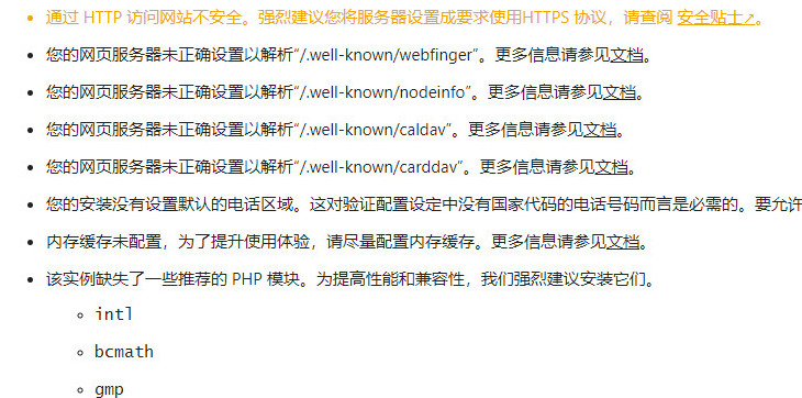 您的网页服务器未正确设置以解析“/.well-known/nodeinfo”。更多信息请参见文档。 如图: nextCloud升级21版本后就这样了,nextcloud太特么激进了,PHP要8..0,大爷的。 caldav和calddav解决了,按照之前的方法就OK了。 但是这个新出现两个警告,郁闷。怎么设置都不得行。 添加如下: location ^~ /.well-known { rewrite ^/\.well-known/webfinger /public.php?service=webfinger last; rewrite ^/\.well-known/nodeinfo /public.php?service=nodeinfo last; } 这样也行不通,是不是配置不通? 直接如上图,也不行。 是不是音乐环境不通? 有懂的老师,先在此谢谢了。 附件文件 1. 20210322132603.jpg (120.18 KB) 2. 20210310093642.png (24.88 KB)