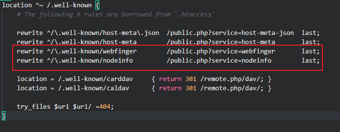 你用这规则是把网址/.well-known/webfinger 重写请求到 /public.php?service=webfinger