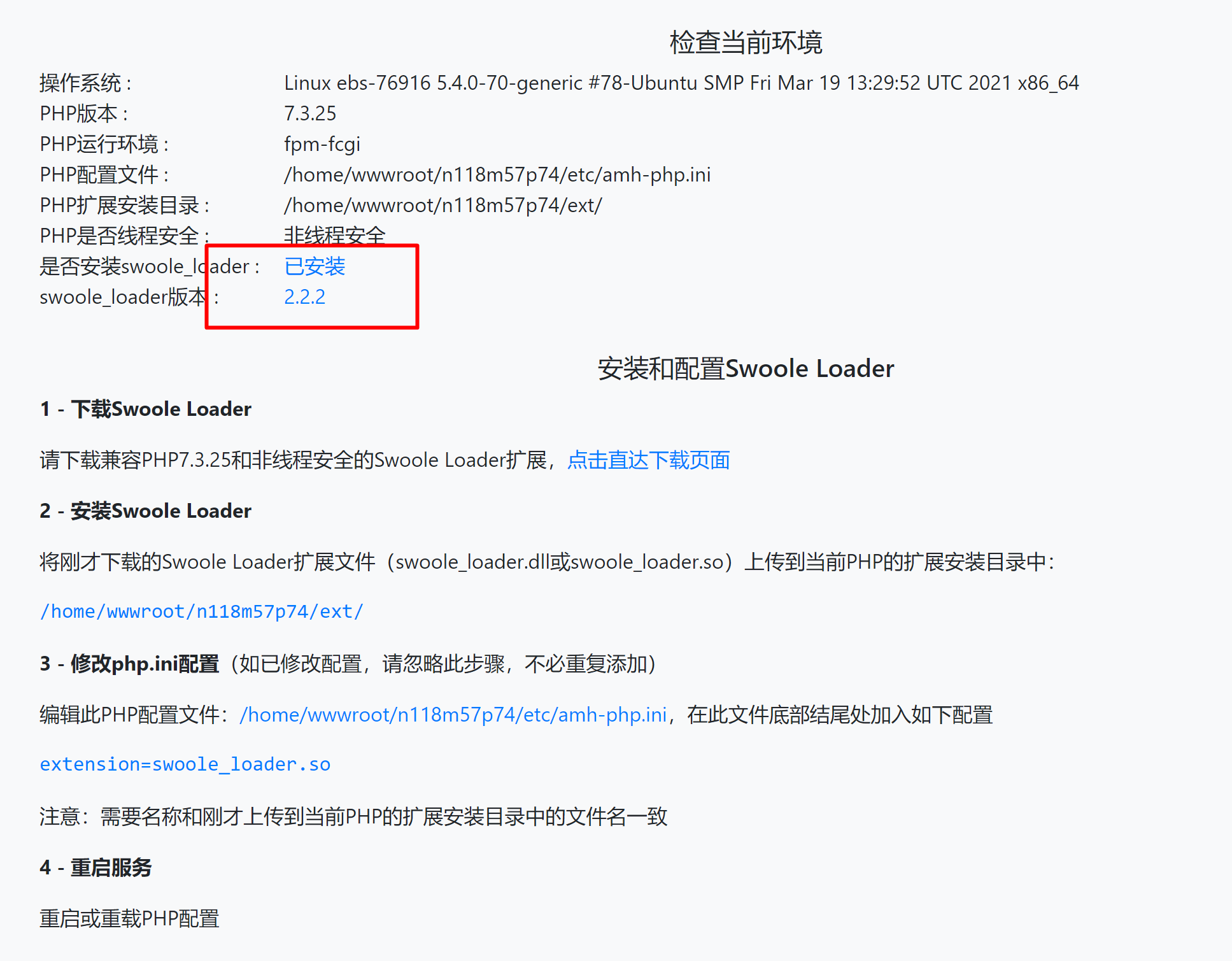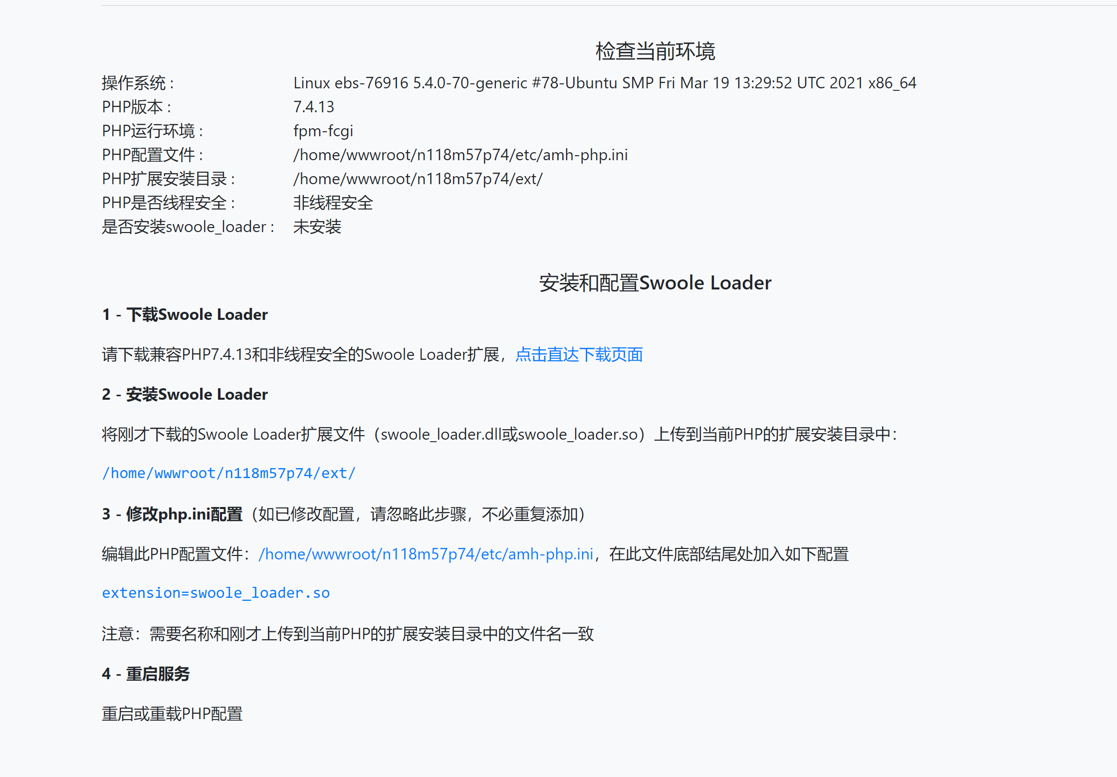 准备工作: 1、卸载当前已安装的Swoole Loader扩展 2、上传附件文件到web根目录 开始配置: 1、访问刚才上传到web根目录的文件,如果没有安装,会出现以下页面 这个页面已经告诉你了需要怎么操作,按照配置说明的第2步开始,上传你的Swoole Loader扩展到说明中的目录,然后修改php.ini配置 1 - 下载Swoole Loader 使用软件开发者提供的或者你已经下载好的 2 - 安装Swoole Loader 将刚才下载的Swoole Loader扩展文件(swoole_loader.dll或swoole_loader.so)上传到当前PHP的扩展安装目录中: /home/wwwroot/n118m57p74/ext/(这个目录是配置页面展现出来的,ext目录是AMH的扩展文件目录) 3 - 修改php.ini配置(如已修改配置,请忽略此步骤,不必重复添加) 编辑此PHP配置文件:/home/wwwroot/n118m57p74/etc/amh-php.ini,在此文件底部结尾处加入如下配置 extension=swoole_loader.so (文件名以实际名字为准,实际名字可能为:swoole_loader74.so等,根据你的版本来定) 注意:需要名称和刚才上传到当前PHP的扩展安装目录中的文件名一致 4 - 重启服务 重启或重载PHP配置 重启PHP后,你可以刷新一下配置页面,看看安装情况, 同理,安装sg11扩展也是一样的方法,自己开始折腾吧! 配置文件下载: 请直接在文末下载配置文件,如果也需要下载Swoole Loader扩展,可以联系我 附件文件 1. Screenshot_1.png (194.02 KB) 2. Screenshot_2.png (193.08 KB) 3. swoole-compiler-loader.zip (3.95 KB)