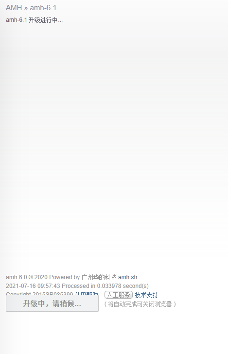 如果有提示,祝贺升级成功提示的话,那就是升级完成了。 到面板首页看是否已经升级到6.1。 如果是下载源码卡住没能下载成功是程序会终止升级, 排查服务器连接amh.sh是否正常,再升级。