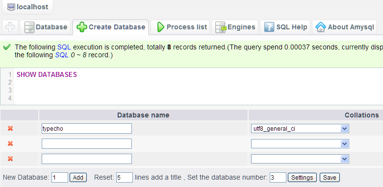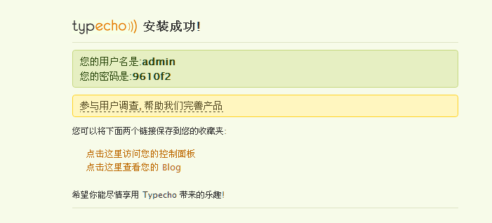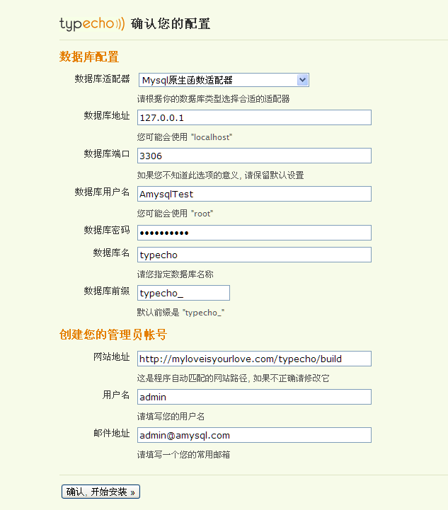 ----------------------------------------- 下面以 myloveisyourlove.com 虚拟主机做示例。 1、进入主机目录下载并解压Typecho 0.8安装包。 cd /home/wwwroot/myloveisyourlove.com/web; wget http://typecho.googlecode.com/files/0.8\(10.8.15\)-release.tar.gz; tar -zxvf 0.8\(10.8.15\)-release.tar.gz; 2、浏览器访问Typecho目录进行在线安装。 建立一新数据库:typecho (或使用已存在的数据库,可忽略此步骤) ![]() 访问地址: http://myloveisyourlove.com/typecho/build/install.php?config 注意,MySQL连接地址使用127.0.0.1 ----------- ![]() ----------- ![]() 3、更改主机配置,让虚拟主机支持PATHINFO 可参考此贴进行更改虚拟主机conf文件的配置。 http://amysql.com/bbs/post-25-1-3.htm 演示地址如下: http://myloveisyourlove.com/typecho/build/