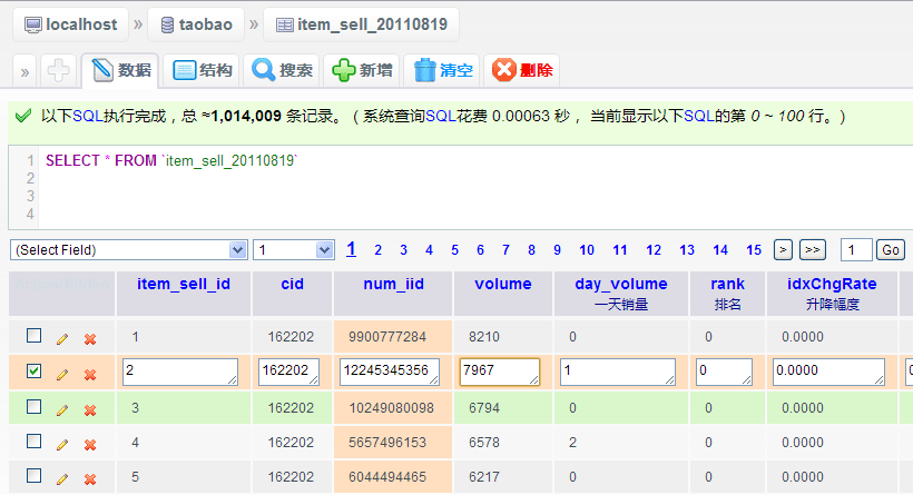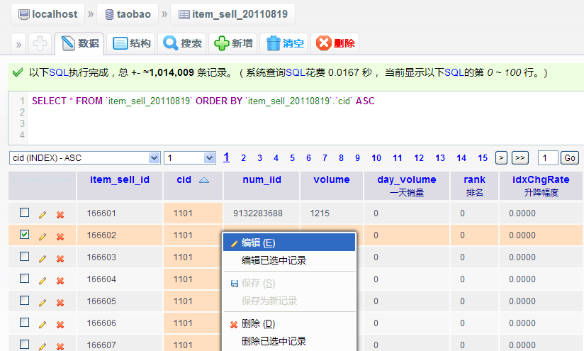 系统设置中增加了两项这方面的设置, 其中一项是开启数据计数缓存 ,数据查询很耗时的地方就是数据统计总数方面。 如果开启此项第一次查询数据后过,数据统计的总数将会临时记录下来, 这样如果频繁翻页与字段排序就不会再次去统计总数, 速度将大幅度提高。当有更新删除操作数据时临时记录的总数才再次刷新。 另一项是开启计数精确查询,这一项仍然与数据计数有关, 如果不开启此项,数据表总数计数将 SHOW TABLE STATUS FROM 数据库 读取Rows字段获得表的行数目, 这数目对于MyISAM引擎的数据表来说是精确的,而对于InnoDB引擎来说只是一大约值。 如数据量不大可以开启此项,查询数据以保可得到一精确的总数, 对于大数据查询如上百上千万数据查询建议不开启此项设置,有助于更快响应数据结果。 --- 因此两项用户可根据本地数据环境做对应的设置。 无大量数据可关闭数据计数缓存,开启计数精确查询。 大数据则设置开启数据计数缓存,关闭计数精确查询。 如下:上百万数据查询。 不开启精确查询,出现≈符号。 (≈1,014,009) ![]() --- 开启缓存计数,再次查询出现+-符号,(+- ≈1,014,009) ![]()