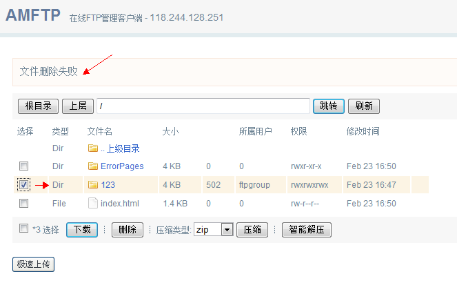 先建主机,再建ftp用户,然后文件通过ftp上传或是用AMFTP上传,才有权限。 AMFTP上面所属用户组是ftpgroup才可删除、写操作。