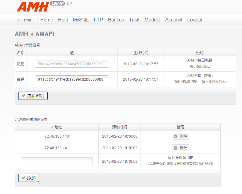 ----------------------------------------- 模块描述: 引用: AMAPI - AMH面板API接口模块,使用接口可管理维护AMH面板所有功能,包括PHP、MySQL、Nginx等各方面。AMAPI用途:利用接口可整合开发基于AMH面板的第三方应用程序,如开通主机、FTP等,同时可结合AMH其它功能模块使用,开通AMProxy反代网站等。 安装: 1、下载AMAPI模块脚本。 # cd /root/amh/modules && wget http://amysql-amh.googlecode.com/files/AMAPI-1.0.zip && unzip AMAPI-1.0.zip && rm -f AMAPI-1.0.zip; 2、安装面板AMAPI模块。 # amh module AMAPI-1.0 install; ---------------------------- 或进到面板后台 AMH » Module » AMAPI-1.0 » 安装 ![]() » AMAPI 使用说明 1) 调用AMAPI接口允许执行AMH所有命令。 2) 每执行一命令系统都有日志记录,如发现异常或密钥泄露请更新密钥生成新密钥,避免非法调用。 3) 建议添加调用IP限制,允许可信任来源IP地址调用AMAPI接口,如无添加即不做IP限制。 4) AMAPI 调用说明 AMP接口调用地址: http://ip:端口号/index.php?c=amapi&a=call 必须以POST方式提交数据,提交两个参数amapi_pass与amh_cmd。 amapi_pass为密钥,从模块管理中获取。 amh_cmd为AMH命令,AMH命令需使用base64_encode函数转码后提交。 ---------------- AMH命令使用参考: AMH命令全集 http://amysql.com/bbs/post-196-1-1.htm php调用amapi实例 http://amysql.com/bbs/post-209-1-1.htm