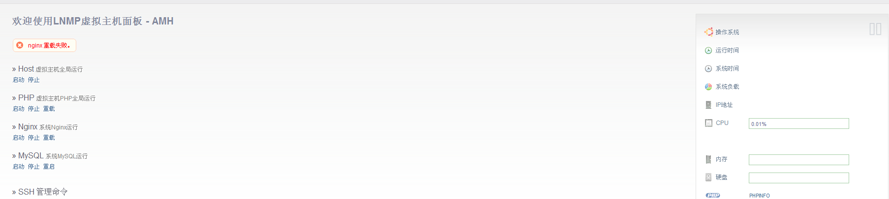 ![]() 执行后,这些功能都失效了 ============以下是执行后的信息================ [root@XuYan~]# /etc/init.d/amh-start ============================================================= [LNMP/Nginx] Amysql Host - AMH 4.2 http://Amysql.com [OK] Nginx stop ============================================================= [LNMP/Nginx] Amysql Host - AMH 4.2 http://Amysql.com Shutting down MySQL. SUCCESS! [OK] MySQL stop ============================================================= [LNMP/Nginx] Amysql Host - AMH 4.2 http://Amysql.com Starting MySQL.. SUCCESS! [OK] MySQL start ============================================================= [LNMP/Nginx] Amysql Host - AMH 4.2 http://Amysql.com [Notice] All PHP start... ============================================================= [LNMP/Nginx] Amysql Host - AMH 4.2 http://Amysql.com [Notice] anti-i.com PHP start... [OK] anti-i.com PHP start Starting pure-config.pl: Running: /usr/local/sbin/pure-ftpd --daemonize -A -c50 -B -C8 -D -E -fftp -H -I15 -lpuredb:/etc/pureftpd.pdb -lunix -L10000:8 -m4 -s -U133:022 -u100 -k99 -Z -p10100:10110 ============================================================= [LNMP/Nginx] Amysql Host - AMH 4.2 http://Amysql.com [OK] Nginx start