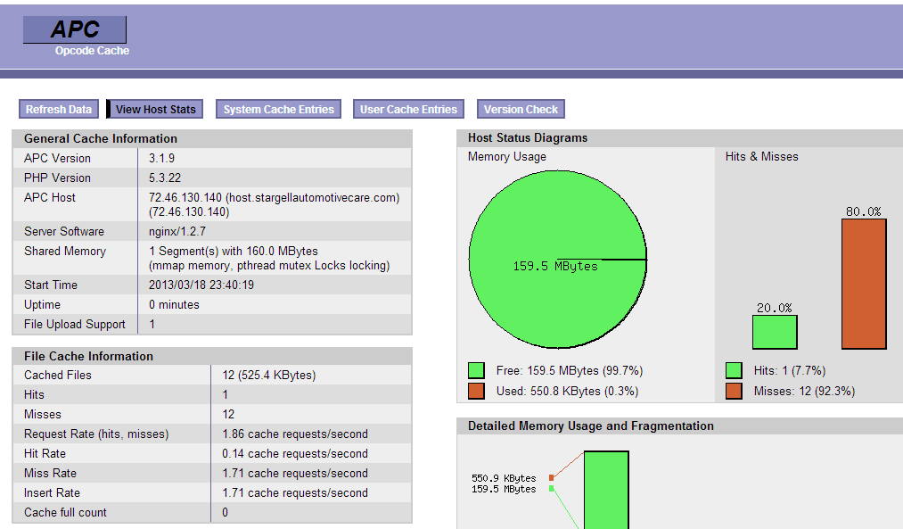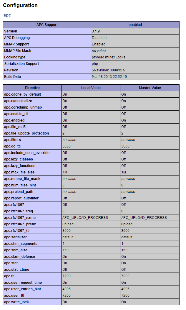 看到了 [APC] extension = "/usr/local/php/lib/php/extensions/no-debug-non-zts-20090626/apc.so" apc.enabled = 1 apc.cache_by_default = on apc.shm_segments = 1 apc.shm_size = 160 apc.ttl = 7200 apc.user_ttl = 7200 apc.num_files_hint = 0 apc.write_lock = On apc.gc_ttl=3600 [eAccelerator]