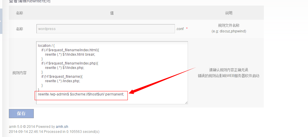 搬家之后 或是新安装wordpress的新手朋友注意了,官方提供的amrewrite-1.0模块虽说规则齐全,但是有些细节自己还是要注意的,搬家或全新安装wordpress后登录后台你会发现点任何一个设置页面都会提示No input file specified.看下图 ![]() 原因是因为在链接里 后台原本的连接是以http:/www.xxx.net/wp-admin/link-manager.php 但是装了伪静态规则之后却变成了http:/www.xxx.net/link-manager.php 那么 自然就打不开页面提示No input file specified.并且404 解决办法: 编辑官方默认的wordpress规则,将以下规则添加至官方规则里并保存“ rewrite /wp-admin$ $scheme://$host$uri/ permanent; ![]() 保存之后 重启相关服务 ,再次访问 你的后台 可以打开了! 申明 一下啊 我自己这段时间都是为这个问题困扰,也问过管理;最后在论坛里找到了相关问题,现在把问题重新拿出来;以便大家多多分享,方便更多的朋友! 感谢:http://amh.sh/bbs/post-643-1-1.htm