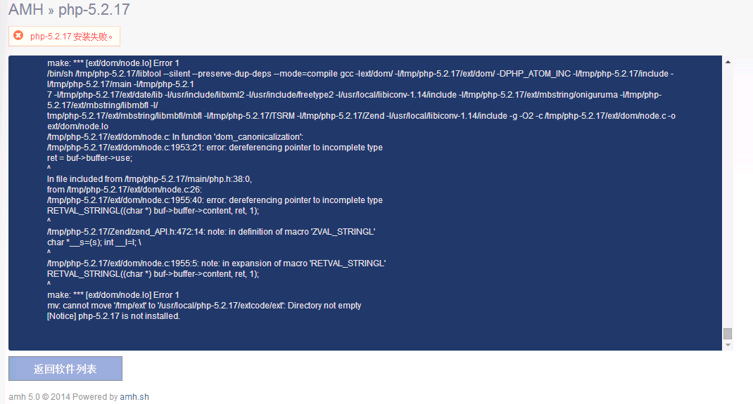 /bin/sh /tmp/php-5.2.17/libtool --silent --preserve-dup-deps --mode=compile gcc -Iext/dom/ -I/tmp/php-5.2.17/ext/dom/ -DPHP_ATOM_INC -I/tmp/php-5.2.17/include -I/tmp/php-5.2.17/main -I/tmp/php-5.2.1 7 -I/tmp/php-5.2.17/ext/date/lib -I/usr/include/libxml2 -I/usr/include/freetype2 -I/usr/local/libiconv-1.14/include -I/tmp/php-5.2.17/ext/mbstring/oniguruma -I/tmp/php-5.2.17/ext/mbstring/libmbfl -I/ tmp/php-5.2.17/ext/mbstring/libmbfl/mbfl -I/tmp/php-5.2.17/TSRM -I/tmp/php-5.2.17/Zend -I/usr/local/libiconv-1.14/include -g -O2 -c /tmp/php-5.2.17/ext/dom/node.c -o ext/dom/node.lo /tmp/php-5.2.17/ext/dom/node.c: In function 'dom_canonicalization': /tmp/php-5.2.17/ext/dom/node.c:1953:21: error: dereferencing pointer to incomplete type ret = buf->buffer->use; ^ In file included from /tmp/php-5.2.17/main/php.h:38:0, from /tmp/php-5.2.17/ext/dom/node.c:26: /tmp/php-5.2.17/ext/dom/node.c:1955:40: error: dereferencing pointer to incomplete type RETVAL_STRINGL((char *) buf->buffer->content, ret, 1); ^ /tmp/php-5.2.17/Zend/zend_API.h:472:14: note: in definition of macro 'ZVAL_STRINGL' char *__s=(s); int __l=l; \ ^ /tmp/php-5.2.17/ext/dom/node.c:1955:5: note: in expansion of macro 'RETVAL_STRINGL' RETVAL_STRINGL((char *) buf->buffer->content, ret, 1); ^ make: *** [ext/dom/node.lo] Error 1 mv: cannot move '/tmp/ext' to '/usr/local/php-5.2.17/extcode/ext': Directory not empty [Notice] php-5.2.17 is not installed.