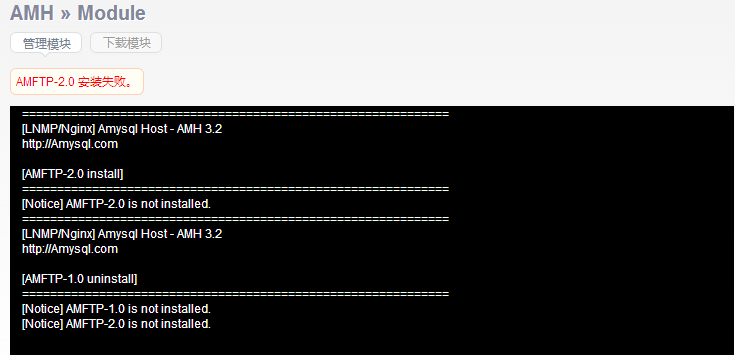amh module download AMFTP-2.0; amh module AMFTP-2.0 install; 用命令去安装看看有没错误提示。