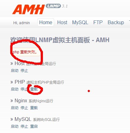php 重载失败, amh php restart 重启看看,看有没报错,不知你做了什么更改。