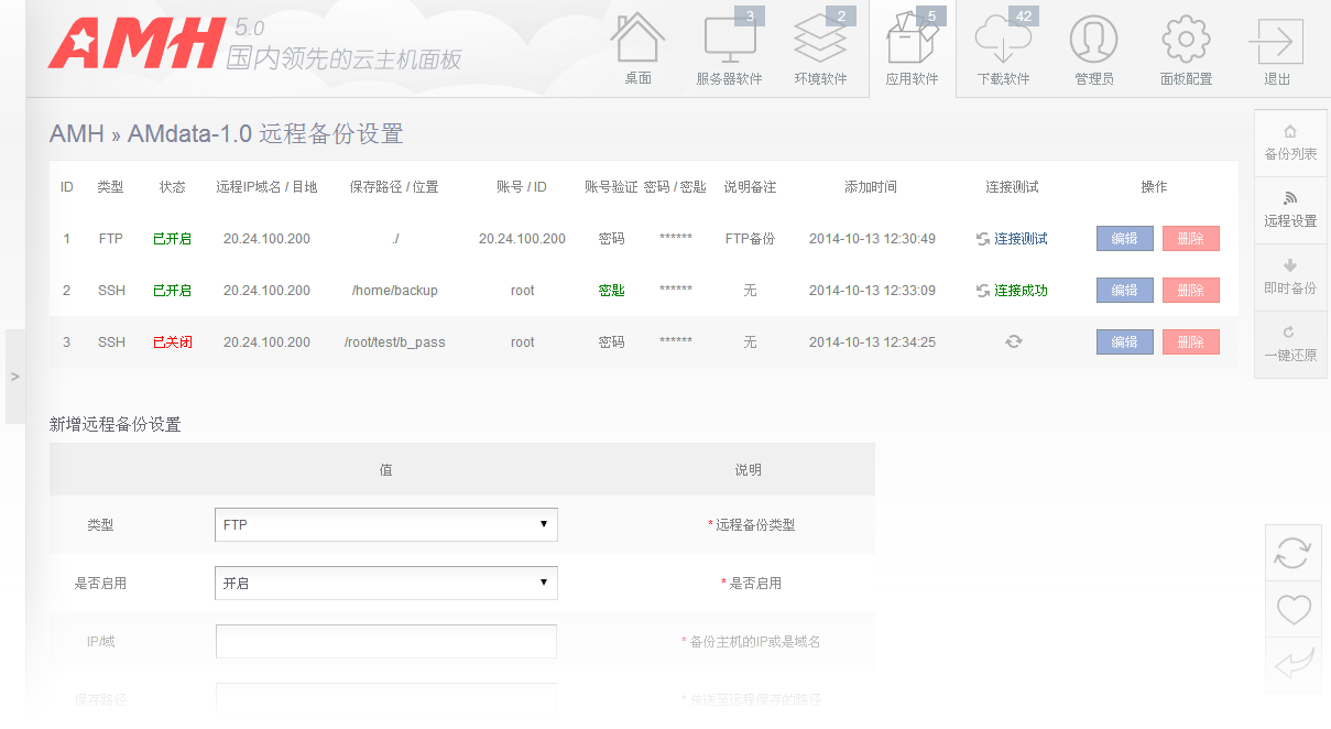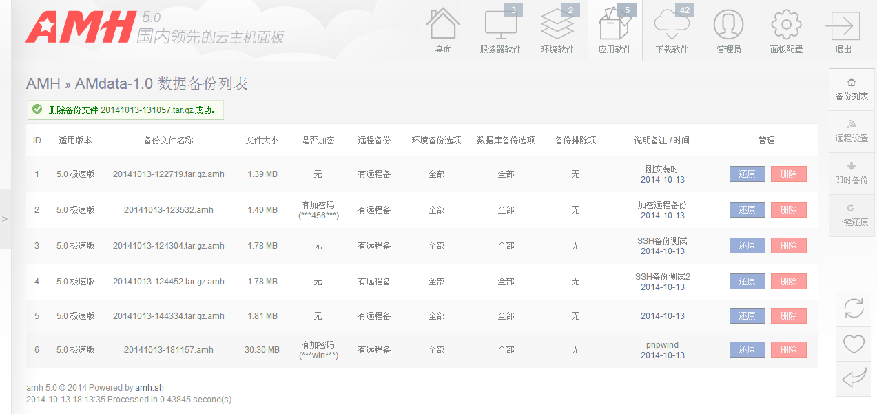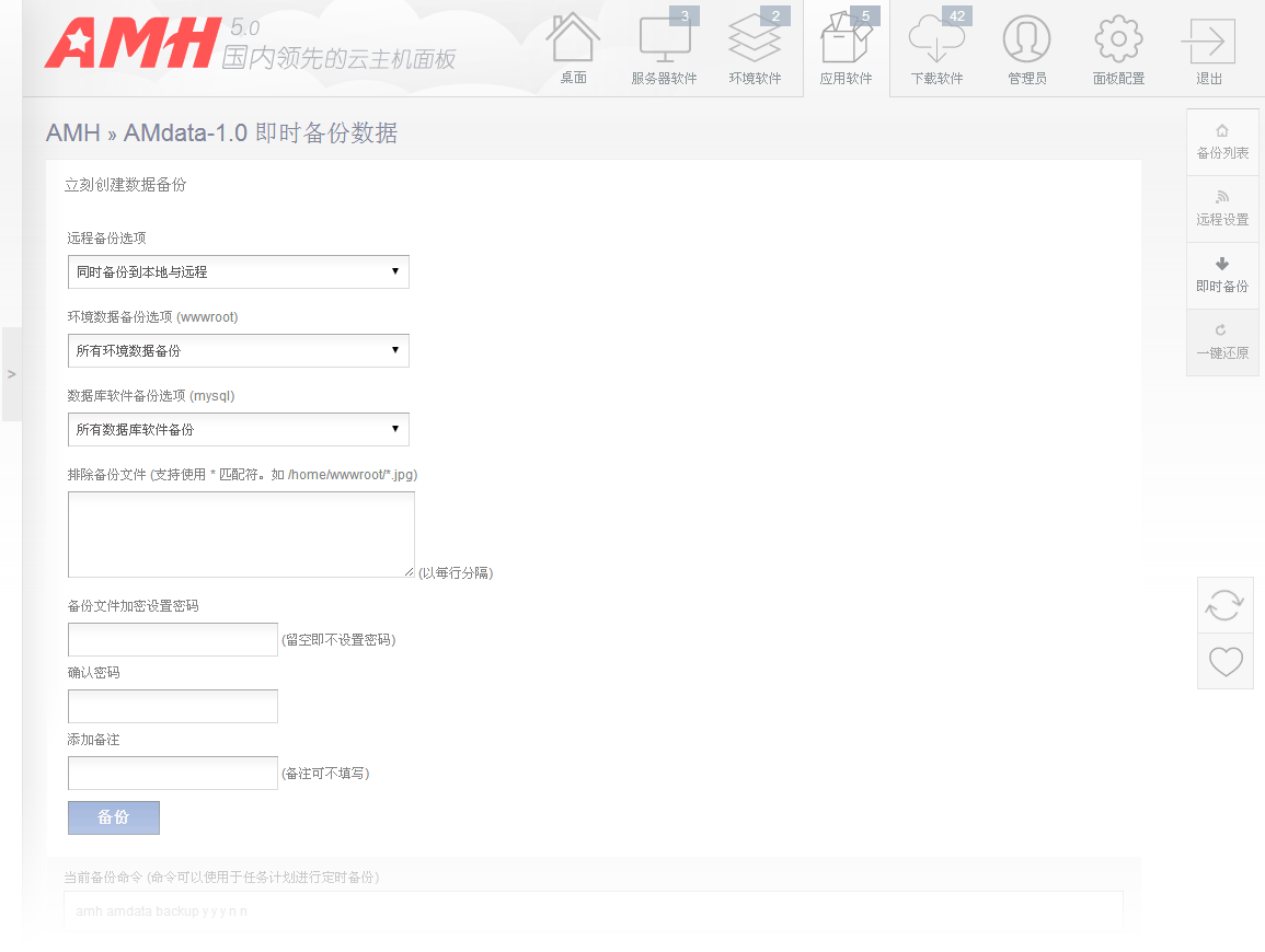 模块分类:应用软件 模块类别:系统工具 版本号:1.0 amdata-1.0 介绍 引用: AMH 面板数据备份、还原恢复全能模块。支持备份所有数据,包括支持选择备份环境数据,可以细分到每个环境下的各个虚拟主机网站。支持选择多个数据库软件进行备份,可以细分到备份数据库软件下的各个数据库。支持本地备份,支持SSH、FTP等接口方式远程异地备份数据。同时支持排除指定文件类型、目录文件进行备份,与支持设置密码,加密安全备份数据。 发布时间:2014-10-13 模块功能: 1) 支持本地、远程或同时本地远程备份。 2) 支持用户设置密码备份文件。 3) 支持选择备份环境数据,可以细分到每个环境下的各个虚拟主机网站。 4) 支持选择多个数据库软件进行备份,可以细分到备份数据库软件下的各个数据库。 5) 支持排除某些文件类型、或目录文件进行备份。 5.0 备份改进功能: 1) 内嵌备份文件信息:取消使用本地数据库保存备份参数,避免转移数据时添加的备注等信息丢失问题。 2) 优化备份与还原功能:备份文件同时直接加密、加密还原直接解压,避免备份、还原过程需双倍数据包大小的存储空间。 3) 解决备份压缩出错影响远程传输问题。 4) 解决不能同时使用多个ssh密钥远程备份问题。 5) 还原功能改进可直接选择文件,并显示更详细备份文件信息。 目前模块已上架。登录面板下载软件图标会有更新提示,下载安装即可使用。 ![]() ![]() ![]() ![]() ![]()