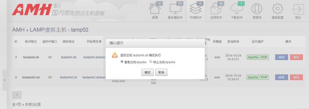 模块分类:环境软件 模块类别:WEB运行环境应用 版本号:1.5 lamp-1.5 介绍 引用: AMH-LAMP环境模块。lamp-1.5 版本增强对PHP新版本的兼容性,与进一步改进优化环境的操作应用。AMH的LAMP环境应用的是Apache2.4最新特性,使用Event模式,PHP使用PHP-FPM进程运行管理。架构与LNMP有所相同,新架构整体性能与灵活性比Apache以往mod php模式有更好的提升。LAMP即为Linux+Apache+MySQL+PHP的环境组合,Apache httpd发展已有很长时间了,这些年来一直被Nginx追赶。目前市场份额Apache仍然占在第一位,Nginx居次。 发布时间:2014-10-24 lamp-1.5 环境软件更新 1) 增加判断环境名称大小写问题。 2) 精确显示环境内存使用情况。 3) 增加处理pid丢失情况PHP启动与停止操作问题。 4) 增强对php新版本的兼容,解决php5.4/5.5会存在启动失败的情况。 5) 默认文件赋于写文件权限。 6) 简化启动、停止、重启等命令。 7) 面板增加可选择重启或停止环境Apache、PHP操作选项。 目前模块已上架。登录面板下载软件图标会有更新提示,下载安装即可使用。 在使用 lamp-1.0 版本的用户,下载后点击安装升级即可。 LAMP虚拟主机 - AMH.png