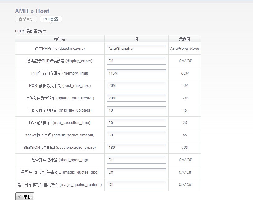 你可以安装文件管理模块, 修改环境目录下的etc/amh-php.ini配置。 与在环境中重启下相应的虚拟主机的php。