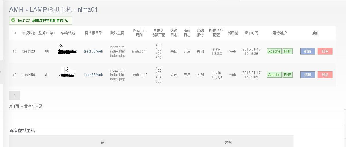 我对于服务器这些不太懂,可以说是小白一个,我也搜索过论坛的内容,能帮到的很少。 目前有这样的疑惑: 我有2个域名 一台vps 所以我想在vps上创建2个网站 后面还可能增加数量 1.我创建了lnmp环境里面设置了A网站, lamp环境内的B网站; 可是当我打开B网站的时候却是A网站的内容;在LAMP环境下我修改过端口。一样还是不可以。2个环境下不可以单独对应不同网站的吗? 如果可以,需注意哪些,我觉得就是那点没设置好。 2.我在lamp环境下搭设了A网站和B网站,修改了其他一个的端口。但是还是一样,2个域名统一指向一个。 请问应该如何设置?