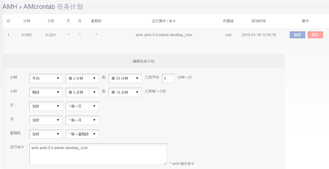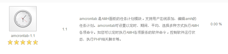 模块分类:应用软件 模块类别:系统工具 版本号:1.1 amcrontab-1.1 介绍 引用: amcrontab 是AMH面板的任务计划模块,支持用户在线添加、编辑amh的任务计划。amcrontab可设置以定时、期间、平均、选择多种方式执行AMH各项命令。如您可以定时执行AMH各项服务的软件命令,控制软件运行状态、执行PHP相关脚本等。 发布时间:2015-01-19 amcrontab-1.1 更新说明 1) 解决1.0版本使用命令超过预定长度编辑保存问题。 2) 增加curl命令,可以添加命令定时访问相关网址 amh amcrontab curl amh.sh 3) 增加LNGX环境命令说明。 4) 优化帮助说明,点击提示命令。 5) 改进时间选择、命令输入各选项,各别项增加文字说明。 目前模块已上架。登录面板下载软件图标会有更新提示, 下载安装即可使用。在使用1.0版本的用户直接下载1.1版本安装升级即可。 AMcrontab 任务计划 - AMH.png ![]() AMcrontab 应用软件 - AMH.png