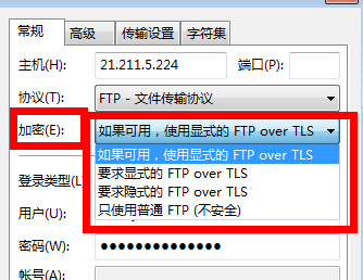 我加密选择“不安全”,传输选“主动模式”,使用的是filezilla