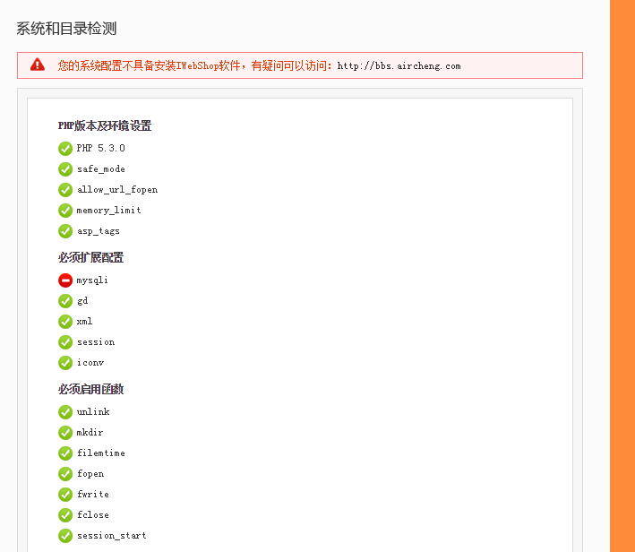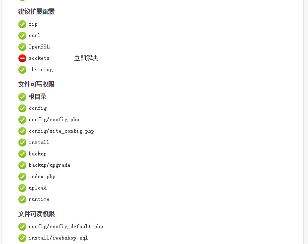 vps环境: centos6 amh4.2面板,现在安装iwebshop提示2个报错,1.必须扩展配置:mysqli, 2.建议扩展配置 sockets