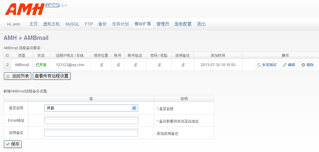 AMH4.0 安装 AMBmail-1.0 邮箱远程备份模块。