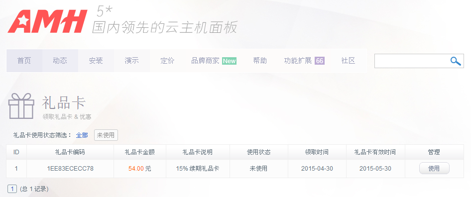 可适用所有新旧授权与所有品牌商家用户, 授权续期12个月即可额外获取账单15%金额的礼品卡。 (礼品卡使用后金额将直接充值至用户账号) 礼品卡使用 http://amh.sh/user/gift.htm 当前活动状态:有效 2015-04-30 amh.sh 礼品卡 - amh.sh.png
