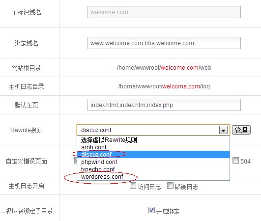 比如我主网站 abc.com 的伪静态规则是 wordpress 而子域名网站 bbs.abc.com 的伪静态是 discuz 如下图 只能选择其中一个规则。改怎么搞呢? ![]()