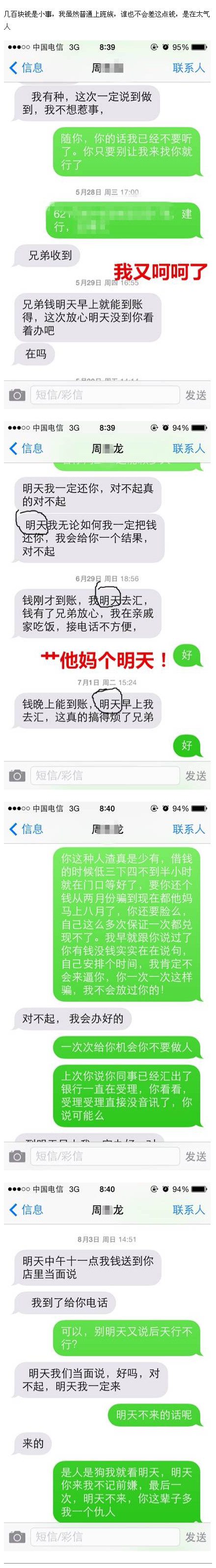 [b]龙哥欠我500块欠了10个月楼主前同事龙哥借了楼主500块钱,从此楼主踏上了艰辛追债路。神奇的龙哥每天都能想出一个新理由耍赖,看完小编都给醉了……小伙伴们身边有这种欠钱不还的奇葩么?