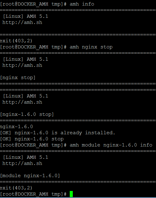 试着在docker中用debian8的镜像装了个AMH5.1,网页面板可以正常使用,但在ssh中执行amh的话只会显示exit(403,2),研究了一下发现有些指令(比如amh nginx start/stop)可以正常执行,而有些则彻底执行不了.