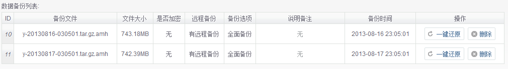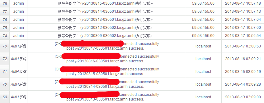 面板操作是php时间,php配置是上海时区,也就北京时间。 备份列表那时间是当前插入记录时间。 看文件名:20130816-030501.tar.amh