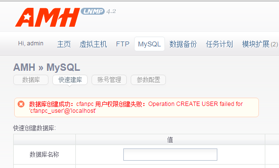 4.2面板创建新的数据库提示 数据库创建成功:cfanpc 用户权限创建失败:Operation CREATE USER failed for 'cfanpc_user'@'localhost'
