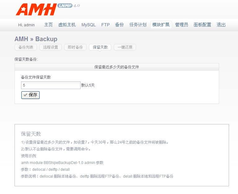 模块名称:BBShijieBackupDel-1.0 功能:AMH面板备份功能增强模块,可设定本地及远程FTP保留的备份文件天数。需添加计划任务执行。 使用: 1、后台设定备份文件保留的天数。 2、添加计划任务执行命令 说明: 保留天数 设置保留最近多少天的文件,如设置7,今天31号,那么25号之前的备份文件将被删除。 ![]() 命令 amh module BBShijieBackupDel-1.0 admin 参数 参数:dellocal / delftp / delall 参数说明:dellocal 删除本地备份、delftp 删除远程FTP备份、delall 删除本地和远程FTP备份 安装步骤: 已收录请面板上下载 目前官方暂未收录 下载安装包至服务器/root/amh/modules/目录,解压缩,删除安装包 amh后台点击安装 安装包下载:[attach]626[/attach] 附、下载BBShijieBackupDel-1.0模块开发脚本: http://amysql.com/file/AMH/4.0/modules/BBShijieBackupDel-1.0.module.tar.gz 附件 BBShijieBackupDel-1.0.zip
