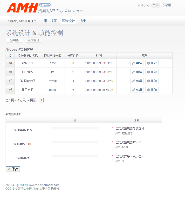 近期全部重写,重新进行设计。 重新写后的版本支持管理员面板上设计用户系统,可自定义按需求架构功能。 这样的好处,很灵活控制,也符合AMH的设计的初衷,自由扩展, AMH面板、模块如有新功能,管理员就可以随时对AMUsers进行制作设计。 困难的地方,需要管理员掌握一定编程知识才能进行DIY设计, 当然您也可以不用动手,如果有其它用户分享出AMUsers设计后数据, 您导入数据也就拥有同样的功能了。 AMUsers 功能介绍 1、用户添加管理 ![]() 2、用户组权限管理 ![]() 3、功能(控制器)管理 ![]() 4、功能(控制器)组件设计 ![]() 5、设计完成 & 用户管理平台 ![]() 用户管理平台的功能完全由管理员设计生成, 计划是实现AMH控制面板上的功能,目前很多方面还需进行调试, 估计能正式发布提供使用还需一些时间。 AMUsers-1.0 下载 此版本目前还在测试阶段, 未正式发布版本请勿使用于生产环境。 [attach]620[/attach] 暂时关闭下载 附件 AMUsers-1.0.zip