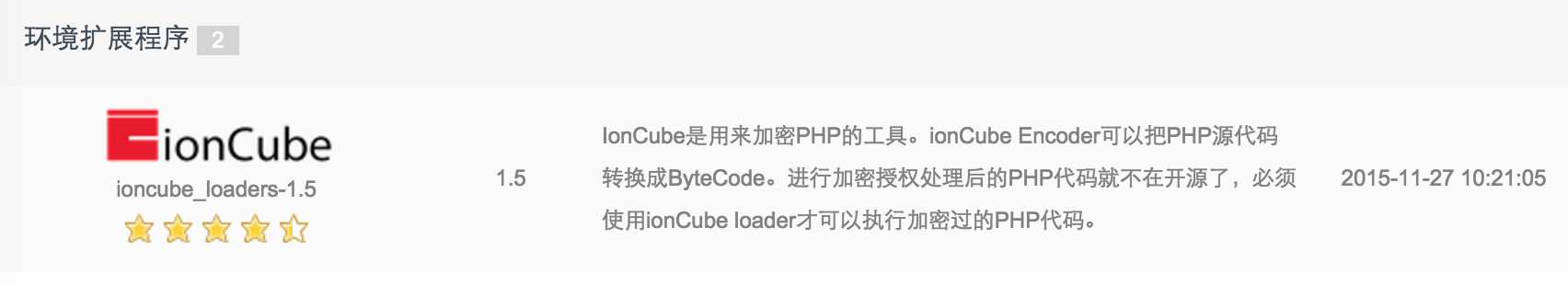 模块分类:应用软件 模块类别:环境扩展程序 版本号:1.5 ioncube_loaders-1.5 介绍 引用: 发布时间:2015-11-27IonCube是用来加密PHP的工具。ionCube Encoder可以把PHP源代码转换成ByteCode。进行加密授权处理后的PHP代码就不在开源了,必须使用ionCube loader才可以执行加密过的PHP代码。 关于ioncube_loaders-1.5 ioncube_loaders-1.2版本已经下架,新版本更新ioncube_loaders支持至目前最新v5.0.19版本。 目前模块已上架,在使用1.2版本的用户请下载安装升级。 ioncube_loaders-1.5.png