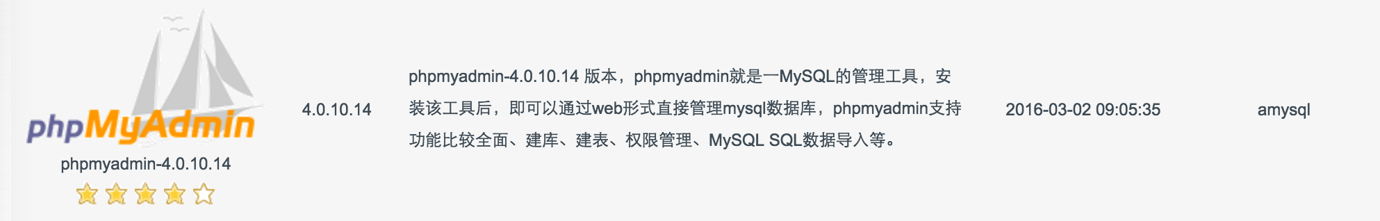模块分类:环境软件 模块类别:服务器软件应用 版本号:4.0.10.14 phpmyadmin-4.0.10.14 介绍 引用: 发布时间:2016-03-02 phpmyadmin-4.0.10.14 版本,phpmyadmin就是一MySQL的管理工具,安装该工具后,即可以通过web形式直接管理mysql数据库,phpmyadmin支持功能比较全面、建库、建表、权限管理、MySQL SQL数据导入等。 phpmyadmin-4.0.10.14 更新说明 更新phpmyadmin至4.0.10.14版本,更新旧版本警告提示等问题, 与更新解决phpmyadmin设置出现500错误问题。 phpmyadmin-4.0.10.14.png