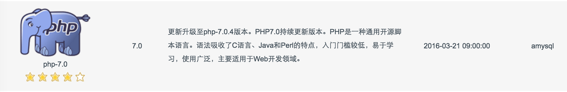 模块分类:服务器软件 模块类别:脚本语言 版本号:php-7.0.4 php-7.0.4 介绍 引用: 更新升级至php-7.0.4版本。PHP7.0持续更新版本。PHP是一种通用开源脚本语言。语法吸收了C语言、Java和Perl的特点,入门门槛较低,易于学习,使用广泛,主要适用于Web开发领域。 发布时间:2016-03-21 关于php-7.0.4 主要更新至php-7.0最新稳定版本php-7.0.4。 在使用php-7.0老版本的用户可以直接升级,环境不需做任何切换。 php-7.0.4.png