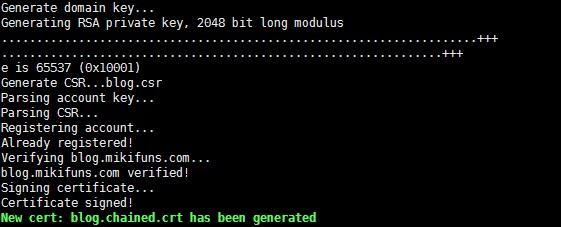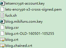 我们应该怎样安装呢?按照官方文档,我们输入指令: ./letsencrypt.sh letsencrypt.conf 这样就会:![]() 嗯大概就这样了反正最后会出现绿字 然后我们看下root目录! ![]() 嗯哼,blog.mikifuns.com.key blog.crt blog.csr 这三个就是我们想要的! [hr] 接下来,我们会用到重命名命令和移动命令,就全部完事了! mv blog.mikifuns.com.key blog.key 这里注意,上面的blog.mikifuns.com.key blog.key blog.crt什么的都要自己设定!mv -f /root/blog.crt /home/wwwroot/com/etc/blog-ssl mv -f /root/blog.key /home/wwwroot/com/etc/blog-ssl mv -f /root/blog.csr /home/wwwroot/com/etc/blog-ssl mv 你的在root文件夹下的文件名.key(这里是一个空格!)标识域名.key 然后运行这些命令后在 /home/wwwroot/环境名称/etc/标识域名-ssl 下面的三个文件就会更新!mv -f /root/标识域名.crt /home/wwwroot/环境名称/etc/标识域名-ssl 以此类推懂了吧 ↓自己试着改改↓ mv -f /root/blog.key /home/wwwroot/com/etc/blog-ssl mv -f /root/blog.csr /home/wwwroot/com/etc/blog-ssl 然后!*必须重启apache后再打开你的网站 重启命令:amh apache restart 现在!!激动人心的时刻!! ![]() 你可以去开瓶可乐庆祝下了....当然! 一切还没结束! 要是这么就结束了我写这玩意干啥... [hr] 下节重点!如何定期自动续期证书!