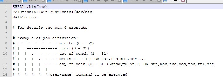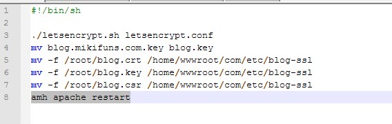 接下来的续期实际上很简单,就是一个定时进行批命令的处理运行就是了. 你需要cron 而这玩意怎么用呢我也说不好(毕竟我也不会)只供参考有问题务必指出来QwQ 网上给出的都是 yum install vixie-cron 这样的,但实际操作时:yum install crontabs chkconfig crond on //开启启动该服务 yum install vixie-cron 我没成功,找不到包. 所以我运行了第二个命令,然后貌似成功了 具体怎么办实际上我也不清楚所以还是个问多问大神多查资料吧.网上说的都很怪我也是没看懂. 然后进入全局配置文件 (/etc/crontab)crontab是文件的名字!不是目录! 文件看起来这样的: ![]() 然后这里需要输入命令了!这里该怎么办? 莫慌!我们先创建个sh批处理文件(照葫芦画瓢会不) 实际上就是把之前的命令全都列好放到一个文件夹里: ![]() like this 这次该怎么替换不用教了吧,很简单! 然后我们把编辑好的文件!注意要先转换! ![]() 真的很重要!不转换的话linux无法运行的! 然后我们再把保存的文件复制到/root目录下 这里命名以ssl.sh为例. 紧接着我们回到刚才的那个crontab文件,这么编辑: 0 0 1 * * root /root/ssl.sh 意思是每月的1号0时0分运行这个命令,当然你可以自己定制,只要别多余90天就好,其次推荐在网站访问量最少的时候运行!这里的root 是以root用户运行 后面的就是命令的地址咯~ 就这样,一切都结束了! [hr]小记:最后的这个定时处理因为时间关系没有验证,所以希望各路大神能够替下建议指点问题,真的很感谢! 同时指出!进行这些操作前必须备份全部数据! 数据无价! [hr] 最后感谢 支持 https://github.com/xdtianyu/scripts/blob/master/lets-encrypt/README-CN.md 技术文档 https://www.logcg.com 让我对ssl有了兴趣写出此文 http://www.2cto.com/os/201411/348362.html ceontab定时任务命令介绍 http://www.centoscn.com/CentOS/help/2014/0527/3034.html 全局配置文件说明 http://blog.csdn.net/woaixiangrikui/article/details/23030147 sh文件编写语法指引 http://bbs.chinaunix.net/forum.php?mod=viewthread&tid=2118684 3楼的mv移动文件语法 以及电脑前的你能够支持我看完全文!非常感谢! 同时既然你看完了,不如告诉你个东西... 在我写这个文章的时候,有个机友也是知道后跟我说,有个地方能直接获取文件不用命令就能获得这个机构的证书.我去看了下,还真是.当然这个就适用于你特勤快自己续期的那种,但是也是多了种方法不是吗~网址献上!https://www.sslforfree.com 希望能对你有所帮助! [hr] 嗯就这些了.如果有问题欢迎各位直接留言在下面! -----------本文仅限在amh.sh和miki.acg的博客间直接发布,转载请务必保留以下信息谢谢! [hr]https://owncloudmiki.b0.upaiyun.com/02.fw.png mikifuns 2016.5.1 劳动节快乐! END