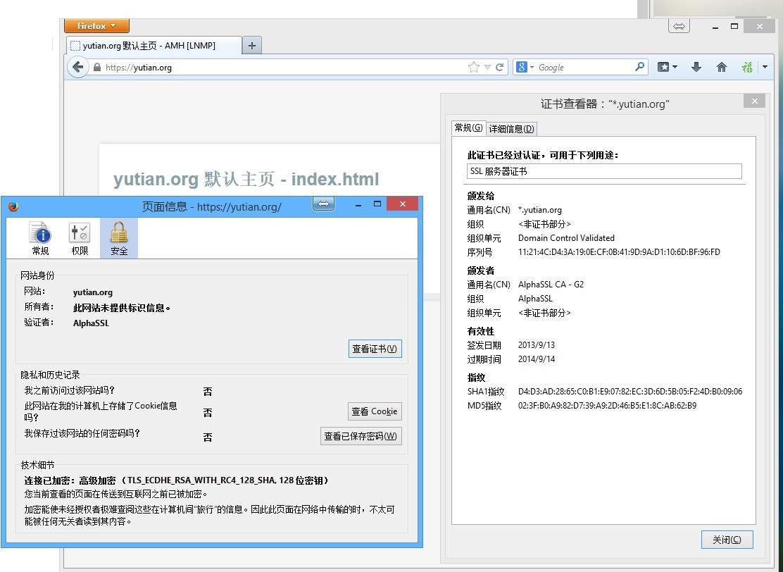 加上SPDY和nginx mysql 加速 优化 这个帖子的google 加速模块也安装好了。 ![]() ![]() ![]() 演示 http://yutian.org/ http://my.yutian.org/ http://blog.yutian.org/ 自动跳转到https 通配符SSL子域名都可以~~ 证书链也木问题了。 火狐访问木问题了。 手机访问也木问题了。 手机访问再也不会提示证书过期了。火狐访问再也不会提示有风险了。 哦也哦也哦也~~ 感谢:A大开发的AMYSQL这么好用、感谢湘儒提供的VPS给我测试、感谢CCTV、感谢BTV、感谢CCAV、 最后感谢自己,居然能折腾两天两夜搞这东西。 搞好了。好有成就感。~~哈~ 虽然不懂代码,不懂LIUX。 连文档都是谷歌翻译看的~~ end 哦拉拉~~睡觉觉去~