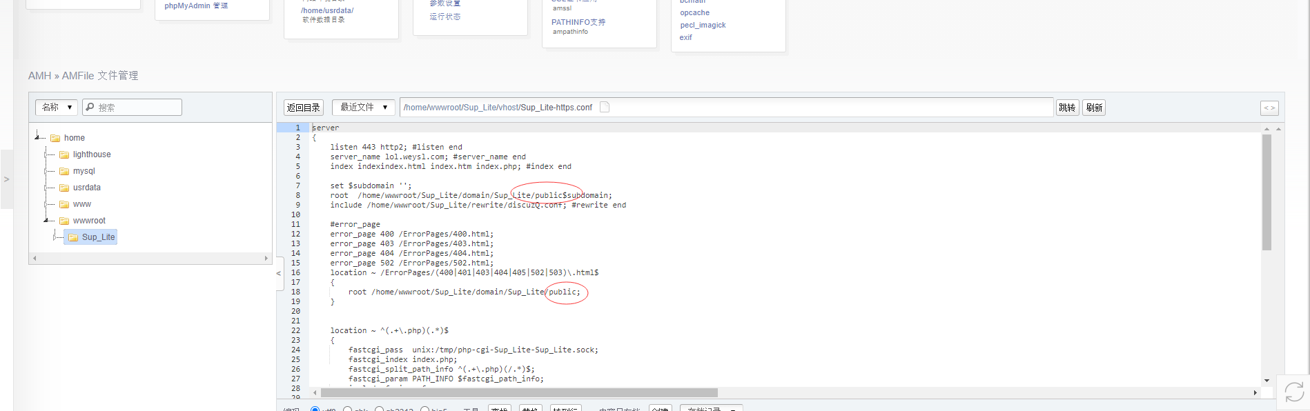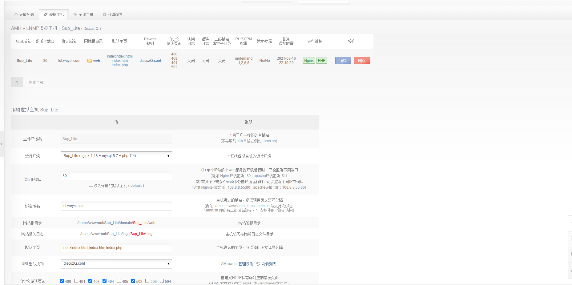 另外,你改的是vhost/name-https.conf vhost/name.conf 也要修改。 手动改配置后也到amrewrite检测配置正确性,与重启nginx。