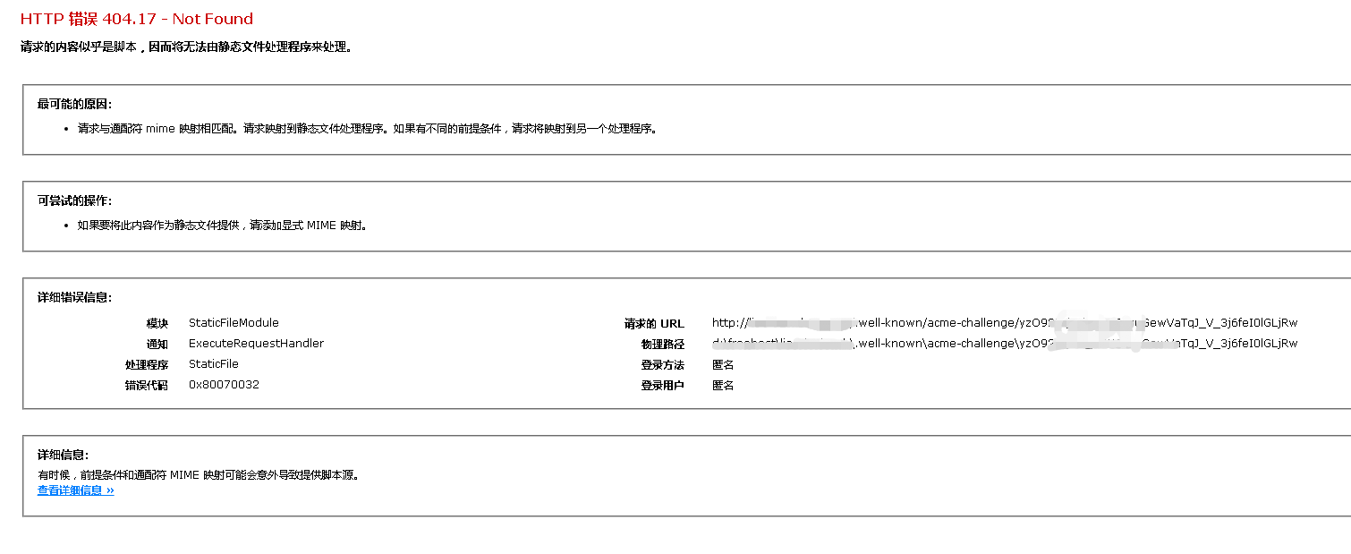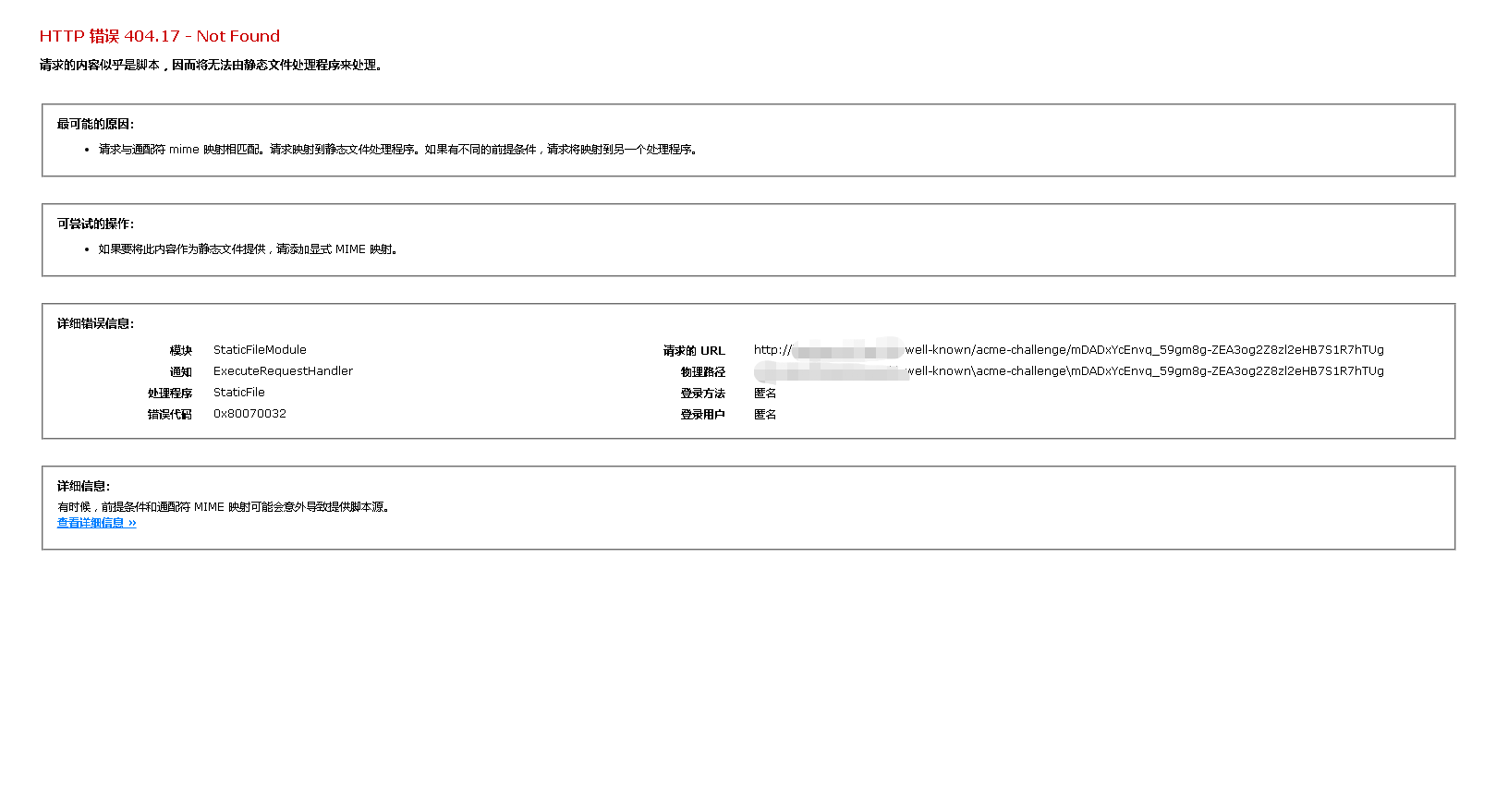引用: 我用的是虚拟主机,赠送的二级域名,通过FTP登录服务器新建了.well-known和acme-challenge两个文件夹,并且在本地新建了文本文档复制“文件内容”,然后更名并去掉了“.txt”,完全按照提示操作无误,最后把这个文本文档上传到acme-challenge里,在点击域名验证那个链接时网页提示“请求的内容似乎是脚本,因而将无法由静态文件处理程序来处理。”,直接点击“完成验证”出现红字Err-102 附件文件 1. 11.png (13.98 KB) 2. 22.png (24.52 KB) 3. 33.png (28.05 KB)