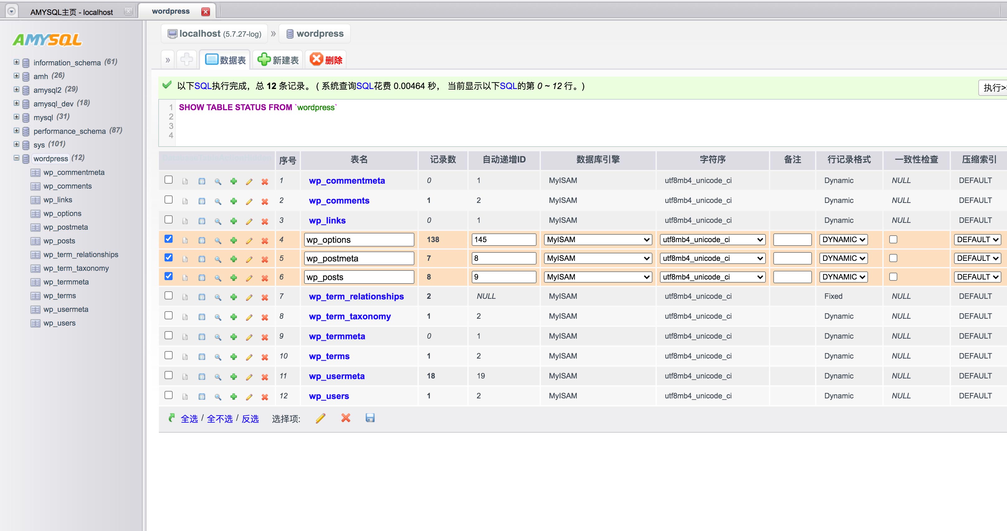 AMYSQL是一个安全高效、简易的MySQL数据库管理Web客户端,使用AMYSQL可简单高效完成日常MySQL数据管理维护,包含数据库、数据表、用户权限各方面的管理。