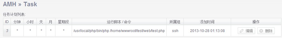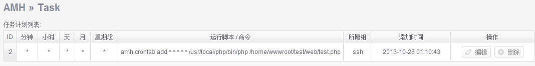 我的操作是这样的,首先使用amh面板,在任务计划输入框输入amh crontab add \\* \\* \\* \\* \\* /usr/local/php/bin/php /home/wwwroot/test/web/test.php,提示成功创建了任务计划,但是却发现test.php并没有照计划运行生成txt文本,之后我重启服务器依然无效,请问各位问题出现在哪里? ![]() 之后我删除该条命令使用ssh编辑,首先运行命令yum install crontabs安装好crontab服务 -> 运行命令/sbin/service crond start //启动服务 -> 运行命令chkconfig –level 35 crond on开机启动,运行命令crontab -e 后输入* * * * * /usr/local/php/bin/php /home/wwwroot/test/web/test.php,保存后查看到amh面板有记录,但test.php依旧没有照计划运行生成文本。 ![]() 我的思路完全是参考过这些网页来的:百科词条crontab,相关网页http://www.oschina.net/question/152468_127952和http://amysql.com/bbs/post-524-2-1.htm。 很想搞好linux的计划任务,现在搞得头都大了,试了很多遍了都不成功。本人自学建站的,对linux的了解也是从amh开始的完全是小白,希望各位耐心指导指导。一直支持amh,希望amh越来越好。