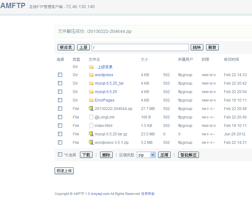 是用AMH面板的么,还是在其它环境下使用。 会受到服务器环境配置影响的,像Nginx、PHP、内存、时间限制等。 看下AMFTP的帮助吧。 amh面板演示机的配置,测试mysql 23.5MB的源码包、tar、zip解压、压缩都正常。