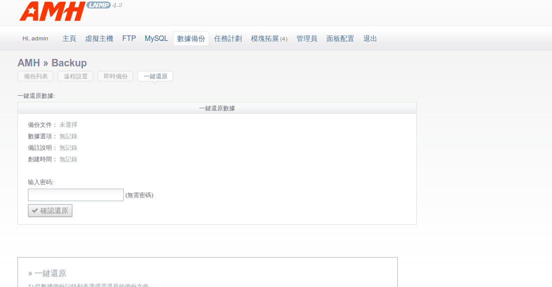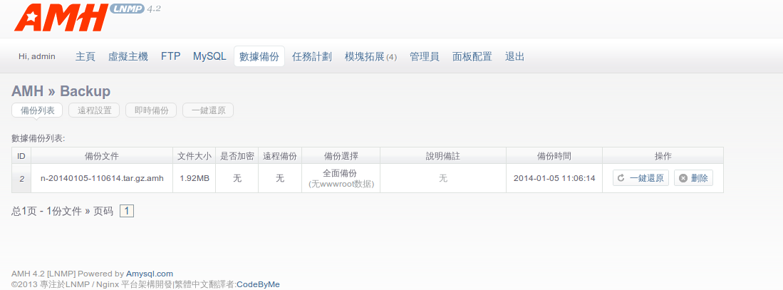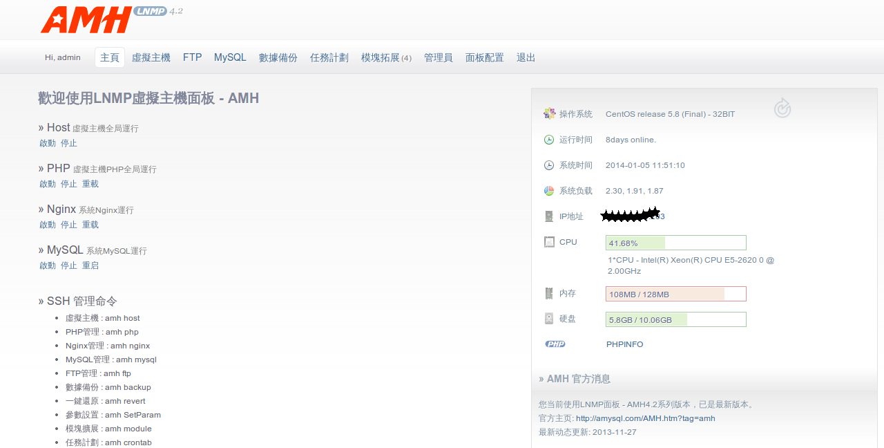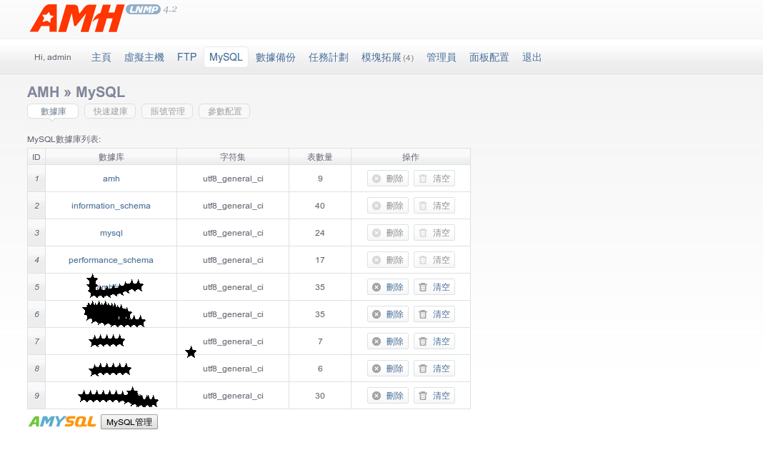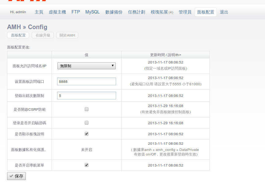 ![]() 引用: Language-Project-AMH 项目信息:这个项目是为了让更多的人能够使用AMH。项目托管地址:https://github.com/Codebyme/AMH-language-project 托管方式:git 引用: 项目托管地址:https://sourceforge.net/projects/amhview/ 托管方式:SVN AMH面板繁体中文版 项目截图: ![]() ![]() ![]() ![]() ![]() ![]() ![]() ![]() ![]() ![]() ![]() ![]() 使用方式: 下载发布的版本包,解压后,覆盖到/home/wwwroot/index/web/中,版本包中共有两个文件夹,分别为Controller和View,两个文件夹都需要覆盖。覆盖后使用IP:8888登录即可 联系方式:codebyme@mail.com 以后,当AMH面板有更新时,我们也会推出相应的更新版本。 VERSION 1.X ===> AMH 4.2 备注: 希望大家可以将遇见的问题提交到项目。我会尽快解决的。 中间有一部分不太对的希望可以提交给我们,以便于及时更改。 提交地址http://git.oschina.net/codebyme/Language-Project-AMH/issues PS.Amysql,下回对PHP文件更改麻烦在更新贴中说一下,我决定是否发布新的版本。 zh-tw03.png ![]() zh-tw06.png