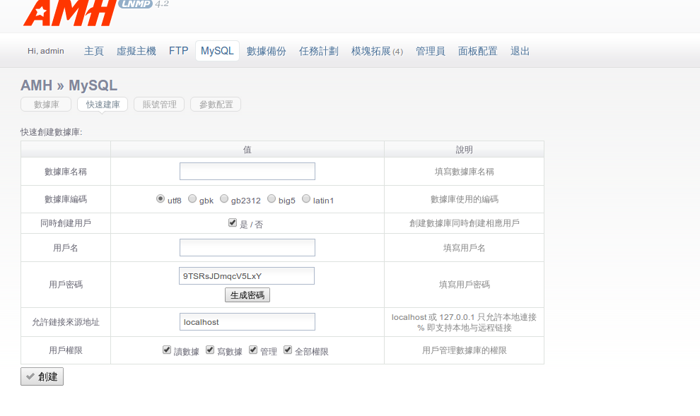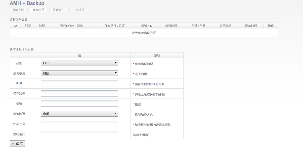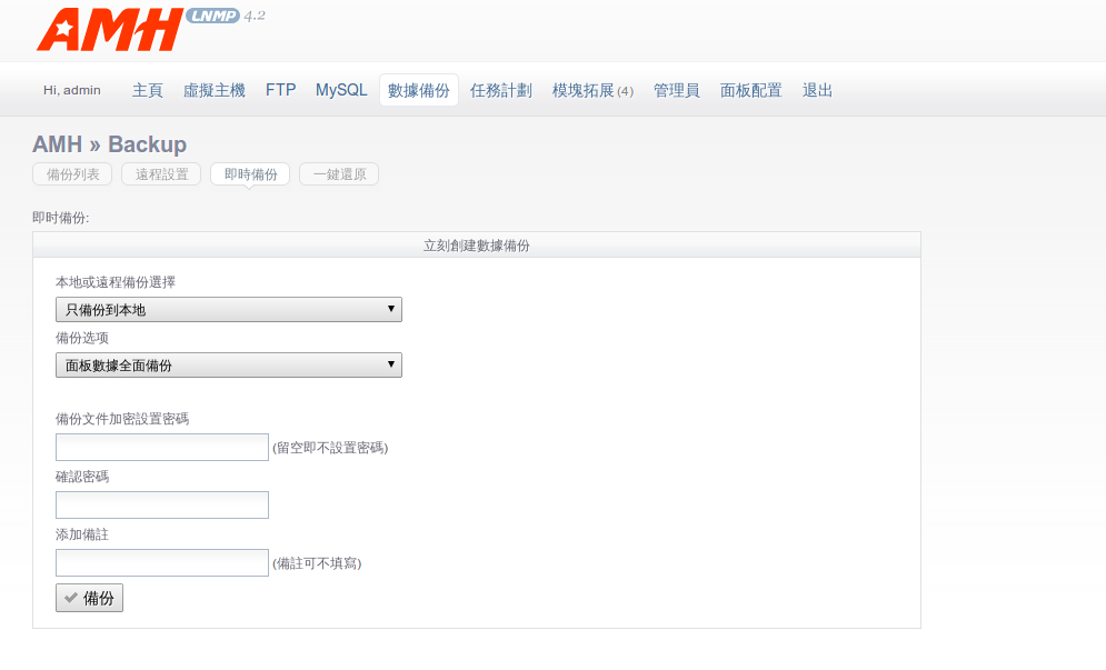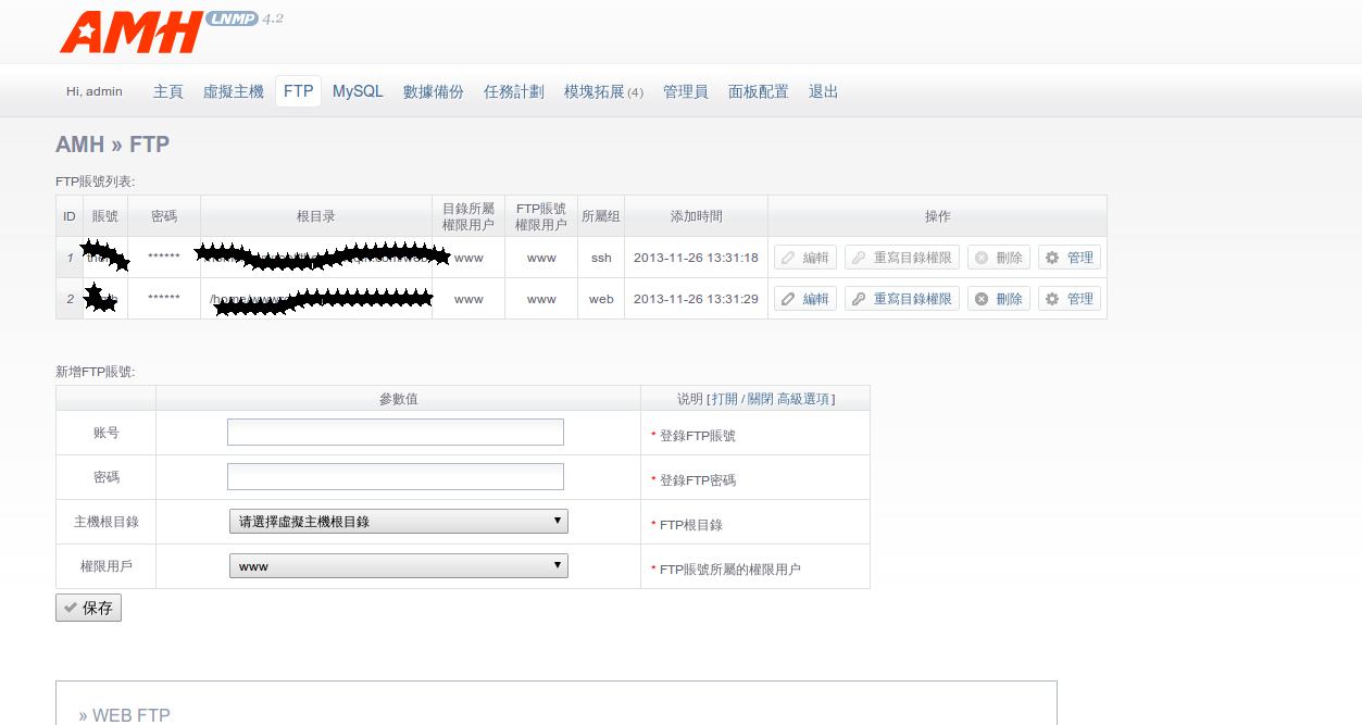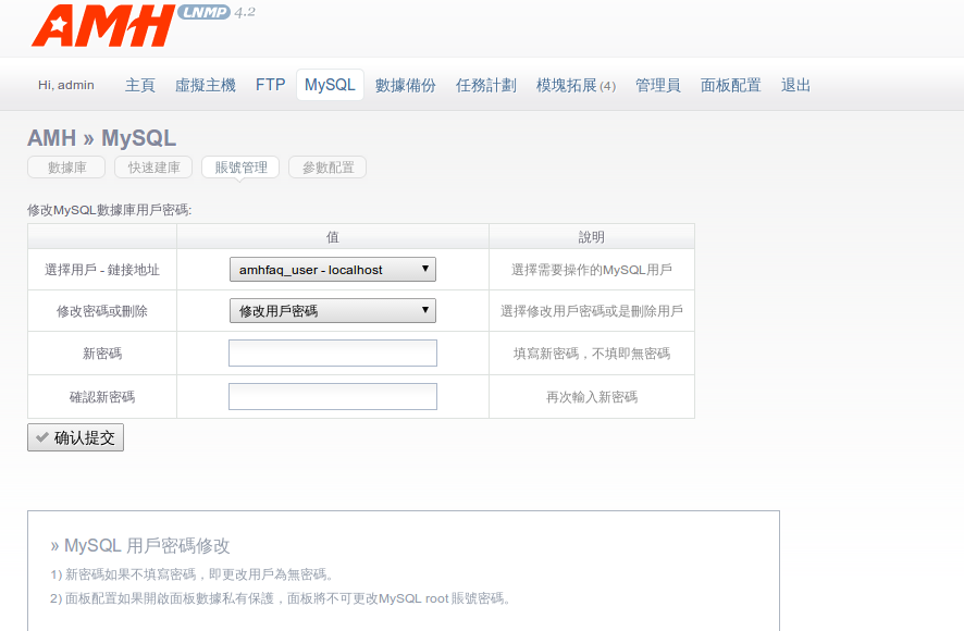 ![]() 引用: Language-Project-AMH 项目信息:这个项目是为了让更多的人能够使用AMH。项目托管地址:https://github.com/Codebyme/AMH-language-project 托管方式:git 引用: 项目托管地址:https://sourceforge.net/projects/amhview/ 托管方式:SVN AMH面板繁体中文版 项目截图: ![]() ![]() ![]() ![]() ![]() ![]() ![]() ![]() ![]() ![]() ![]() ![]() 使用方式: 下载发布的版本包,解压后,覆盖到/home/wwwroot/index/web/中,版本包中共有两个文件夹,分别为Controller和View,两个文件夹都需要覆盖。覆盖后使用IP:8888登录即可 联系方式:codebyme@mail.com 以后,当AMH面板有更新时,我们也会推出相应的更新版本。 VERSION 1.X ===> AMH 4.2 备注: 希望大家可以将遇见的问题提交到项目。我会尽快解决的。 中间有一部分不太对的希望可以提交给我们,以便于及时更改。 提交地址http://git.oschina.net/codebyme/Language-Project-AMH/issues PS.Amysql,下回对PHP文件更改麻烦在更新贴中说一下,我决定是否发布新的版本。 zh-tw03.png ![]() zh-tw06.png