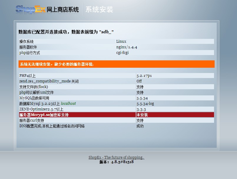 # 大神们就飘过吧~~ # 本人也是个半小白 因为需求需要安装一个SHOPEX # 翻翻论坛看见A大提供了AMH支持php5.2.17p1 解决方案 # 爬爬文尝试下 顺便把过程给记录了下来 分享出来捞点积分过个大年 支持 # 有啥问题的请大家多指教 感谢!!!##php5.2的扩展需要手动编译安装,与配置php5.2的php.ini##SHOPX环境需要 PHP-5.2.17 + ZendOptimizer ##PHP52 A大已经提供了解决方案 我这里只是告诉大家怎么安装ZendOptimizer PHP的扩展 所以大神们勿喷 ------------------ 我是开始教程的分割线 ---------------- PART1 A大的AMH安装PHP-5.2.17 引用: URL: http://amysql.com/bbs/post-1015-1-1.htm AMH支持php5.2.17p1 解决方案 PHP官方早已放弃php5.2版本,停止维护、更新已有好多年了。 但国内还有一些老程序停留在php5.2环境,前段时间也做了一系列投票调查、与收集用户反馈, 最近多用户模块首个版本也基本完成,最后还是决定提供php5.2版本运行支持, 但是同样,除特殊情况外AMH也不再会提供php5.2版本任何更新与维护。 在用php5.2版本的用户应该尽早转到php5.3或更高版本、以更好安全稳定运行。 OK 依A大的教程安装php-5.2.17p1 然后把你的虚拟主机切换至php-5.2.17p1 PART2 安装ZendOptimizer 3.3.3 我这里的是32位的(64位系统自己找找 我找了几个都失效了 囧~)输入命令 wget https://shopexts.googlecode.com/files/ZendOptimizer-3.3.3-linux-glibc23-i386.tar.gz 开始安装tar zxvf ZendOptimizer-3.3.3-linux-glibc23-i386.tar.gz cd ZendOptimizer-3.3.3-linux-glibc23-i386 ./install ![]() # 注意第一个要填的路径是Zend安装路径,第二个是php.ini所在的路径,即/usr/local/php-5.2/etc 下图是Zend地址 默认就好了 ![]() php-5.2的 php.ini所在的路径,即 /usr/local/php-5.2/etc 别填错了.. ![]() 然后这里是否重启apache 我们选< No > ![]() #其它的就是OK,YES 什么的.. 好了安装成功 重启下服务 /etc/init.d/amh-start 我们测试一下 创建个phpinfo查看php信息 或者下载个探针//phpinfo //探针 提示有这样就说明安装成功啦~ 教程到这里基本就差不多完工..上传SHOPEX安装包试试 ![]() 到了这里是不是很惊喜 呵呵。。别高兴得太早了 下一步到检测环境页面 还需要一个Mcrypt.so加密库支持 ![]() 好吧 我们继续.... PART3 安装PHP的mcrypt扩展 登录你的AMH管理面板 - 模块扩展 - 搜索模块 “Mcrypt_Mhash_libmcrypt” 下载并安装 OK安装完之后呢我们要手动编译安装与配置mcrypt 继续, 要有与现有php完全相同的php压缩包, 我直接用的是之前A大安装PHP-5.2.17里的安装包, wget http://code.amysql.com/files/php-5.2.17.tar.gz 展开后进入里面的ext/mcrypt目录 (里面是mcrypt的php扩展)tar zxvf php-5.2.17.tar.gz 然后执行phpize命令(phpize工具是用来扩展php扩展模块的,通过phpize可以建立php的外挂模块,如果没有?google之!) cd php-5.2.17/ext/mcrypt/ phpize 引用: #执行phpize 后 会提示以下信息 #[root@mcrypt]# phpize # Configuring for: # PHP Api Version: 20090626 # Zend Module Api No: 20090626 # Zend Extension Api No: 220090626 执行完后,会发现当前目录下多了一些configure文件,最后执行php-config命令就基本完成了确保你的/usr/local/php-5.2/bin/php-config是存在的 执行以下命令 ./configure --with-php-config=/usr/local/php-5.2/bin/php-config 如果遇到以下错误,请先安装gcc,命令 yum install gcc#configure: error: no acceptable C compiler found in $PATH ------- OK继续输入命令 make && make install make install 之后系统会提示你mcrypt.so文件所在的目录恭喜你大功告成了.. 然后的事就简单了,把它们添加到配置文件里修改php52的php.ini 地址是/usr/local/php-5.2/etc在最后添加代码如下extension=mcrypt.soextension_dir=/usr/local/php-5.2/lib/php/extensions/no-debug-non-zts-20060613/ # 增加到配置文件里 最后重启下服务vi /usr/local/php-5.2/etc/php.ini # 在最后加入 extension_dir=/usr/local/php-5.2/lib/php/extensions/no-debug-non-zts-20060613/ extension=mcrypt.so /etc/init.d/amh-start 查看下phpinfo,mcrypt模块扩展是不是加载了?![]() --------------------我们结束的分割线-------------------------- 支持好了 开始你的SHOPEX之旅吧。。
