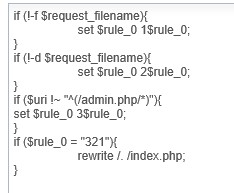 最近装个程序,自带的.htaccess是这样的,网上有个地址可以转换conf,不过转换完以后前台页面正常,后台打不开 RewriteEngine on 我实验了一下,要求前台实现RewriteRule . index.php后台没有重写。# if a directory or a file exists, use it directly RewriteCond %{REQUEST_FILENAME} !-f RewriteCond %{REQUEST_FILENAME} !-d # otherwise forward it to index.php #RewriteRule ^admin/(.*)$ /admin.php [P,L] RewriteRule . index.php 后台必有路径是/admin.php/ 现在怎么判断如果路径不包含/admin.php/就执行RewriteRule . index.php