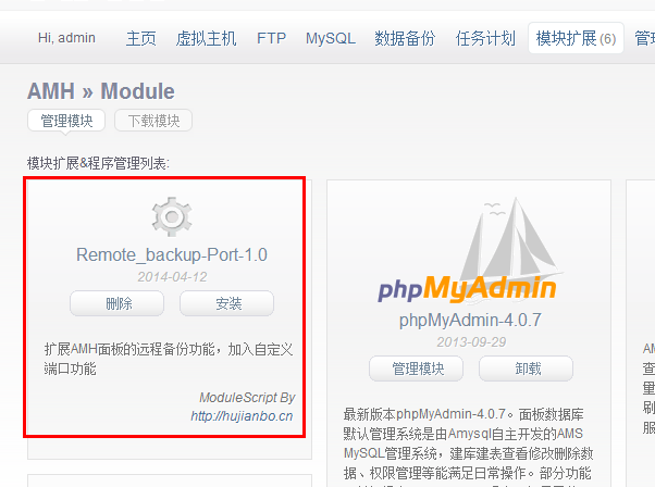 很多童鞋出于安全考虑,会改掉默认的SSH 22和FTP 21端口,但是AMH里面默认的远程备份只支持默认端口,论坛里有关于修改端口的帖子,但是是修改源文件,并且必须指定一个端口,如果有多个远程备份点,但端口不一样,又麻烦了。基于此,特地自己对面板做了些修改,并打成插件包,主要方便新手,因为我自己也是新手~老鸟勿喷。 界面截图: http://hujianbo.cn/wp-content/uploads/2014/04/201404112020571-1024x453.png 使用方法: 下载附件,传到你的VPS,解压到/root/amh/modules/目录下。进入AMH管理面板,模块扩展--管理模块,找到Remote_backup-Port-1.0,点击安装按钮即可。 ![]() 回到 数据备份--远程设置,出现“远程端口”说明已安装成功。 ![]() 新手第一次做模块,有任何意见和问题欢迎批评指出。 ==================================== 4月14日更新: 修正一处疏忽的地方,当没有远程备份条目的时候,“操作”一栏的下方显示一个灰色色块,影响美观 ==================================== 4月28日更新: 1、修改了检查远程主机可用的逻辑,直接使用NC工具判断端口是否开启,而非原先的ping。 2、由于版本修改,增加判断其他版本的功能,如果存在旧的版本将安装不成功,请先卸载旧版本。 3、安装1.1版本会自动安装NC工具,所以比1.0版本稍稍复杂点,有不喜欢的同学可以继续沿用1.0,另外同时修改了1.0的脚本,增加判断其他版本存是否在。 本次修改主要源于论坛里一位同学讲到在禁ping的主机上设置远程备份时候不成功的问题,于是便有了这次版本改动 附件 Remote_backup-Port-1.0.tar.gz Remote_backup-Port-1.1.tar.gz