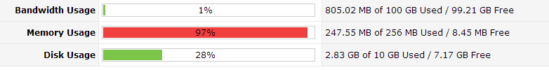 一共就256的内存.. ![]() 活活卡死...只装了AMH,系统是Centos5.1的 貌似一个PHP,就占用了100MB左右. Mysql占用了50左右.. 两个网站,一个没流量.一个每天20流量左右. 这是什么情况?谁能帮忙下..优化优化什么的. OVZ的!