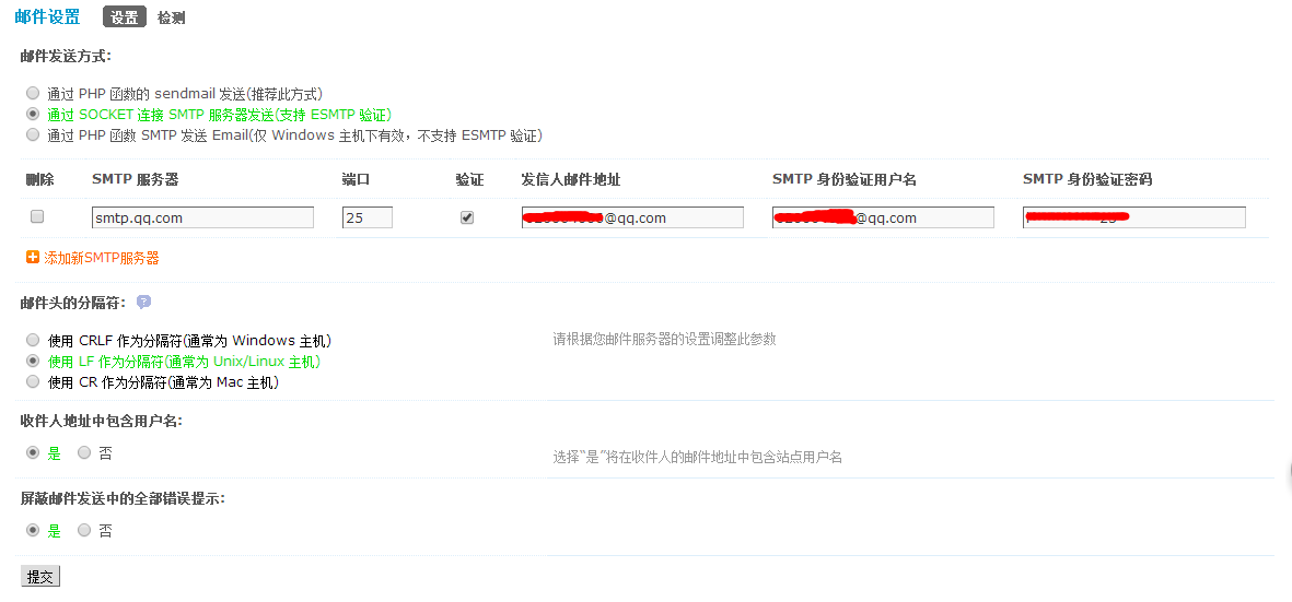 如果我没记错,发件箱需与首页联系邮箱相同,发信地址是邮箱全名。用户名是qq。密码则是passwd 这几点相同既可以发送邮件。 支持