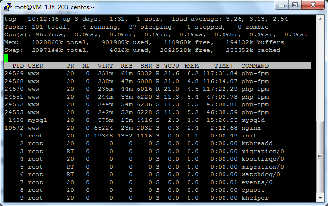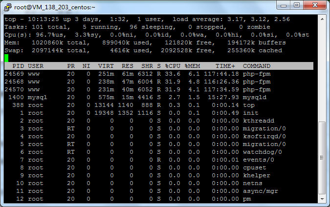 有天晚上蹲到半夜查看,发现是PHP进程突然占用突然飙升,3个PHP进程每个占用CPU33% 有时候会突然出现四五个PHP进程。这情况应该怎么解决 下面是top列表 ![]() ![]()
